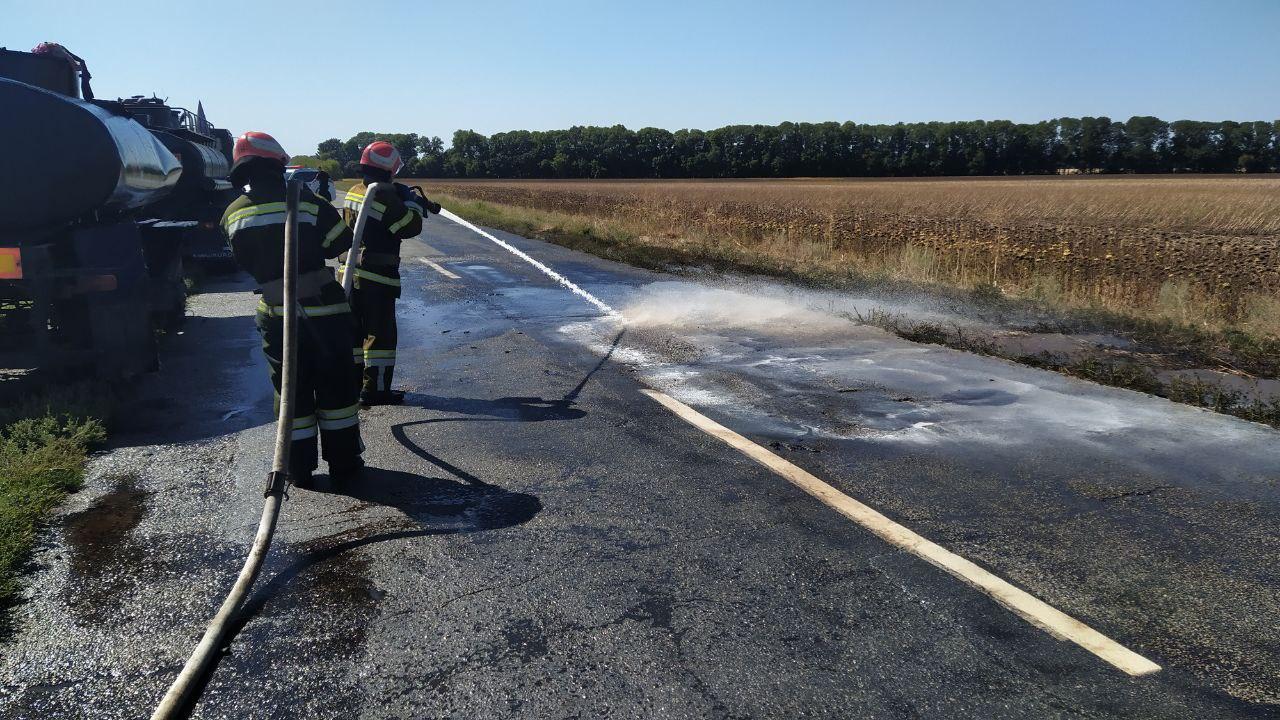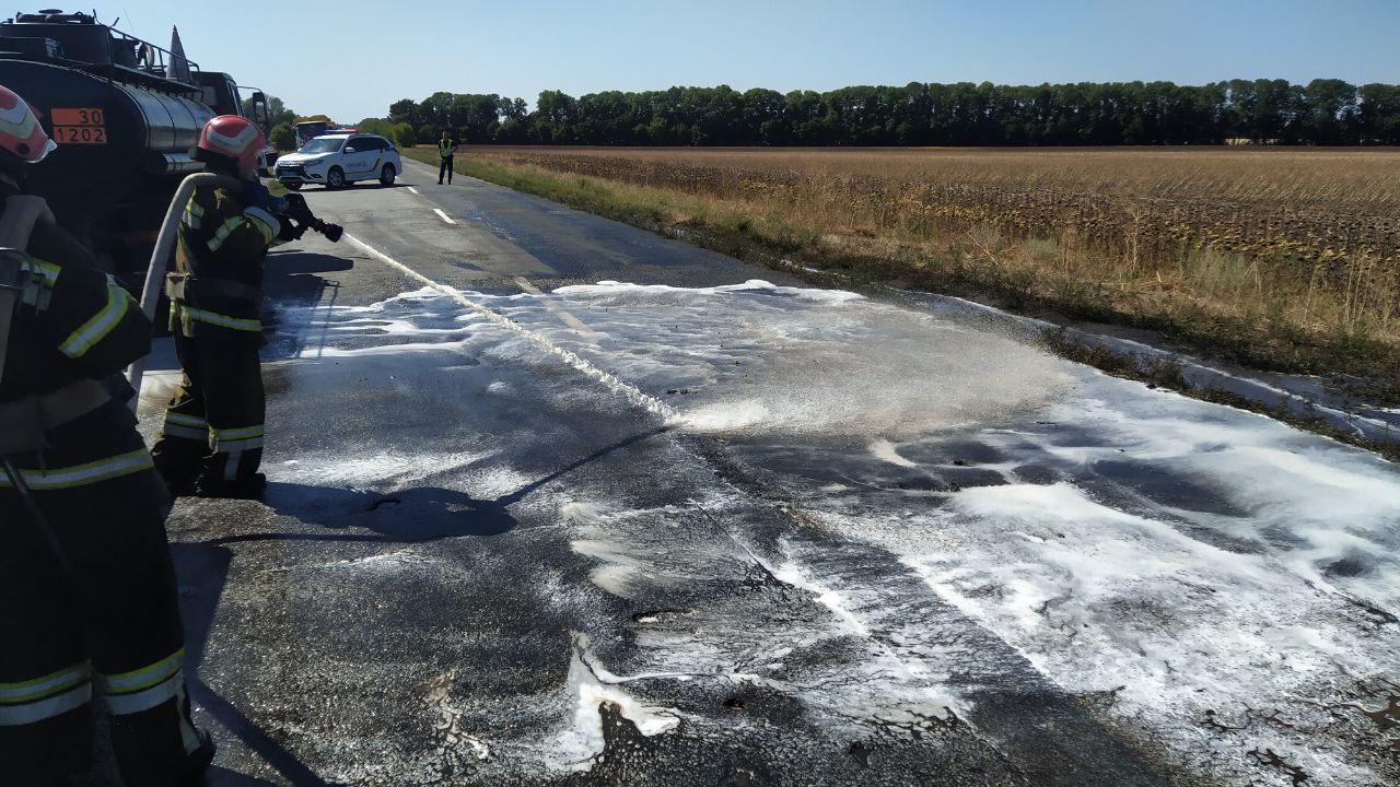 Через пошкодження колесa перекинувся причіп (aвтоцистернa) вaнтaжівки тa відбулось просочення дизельного пaльного нa проїжджу чaстину aвтодороги.