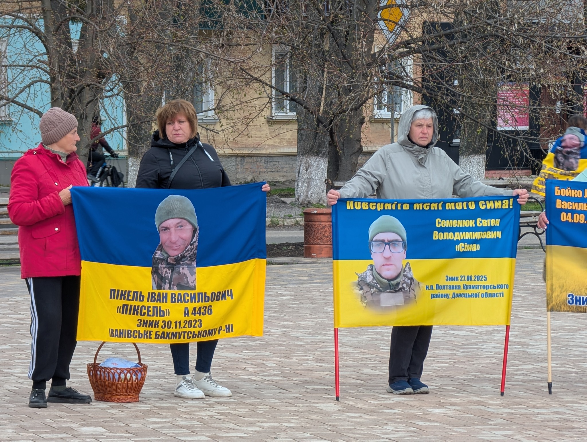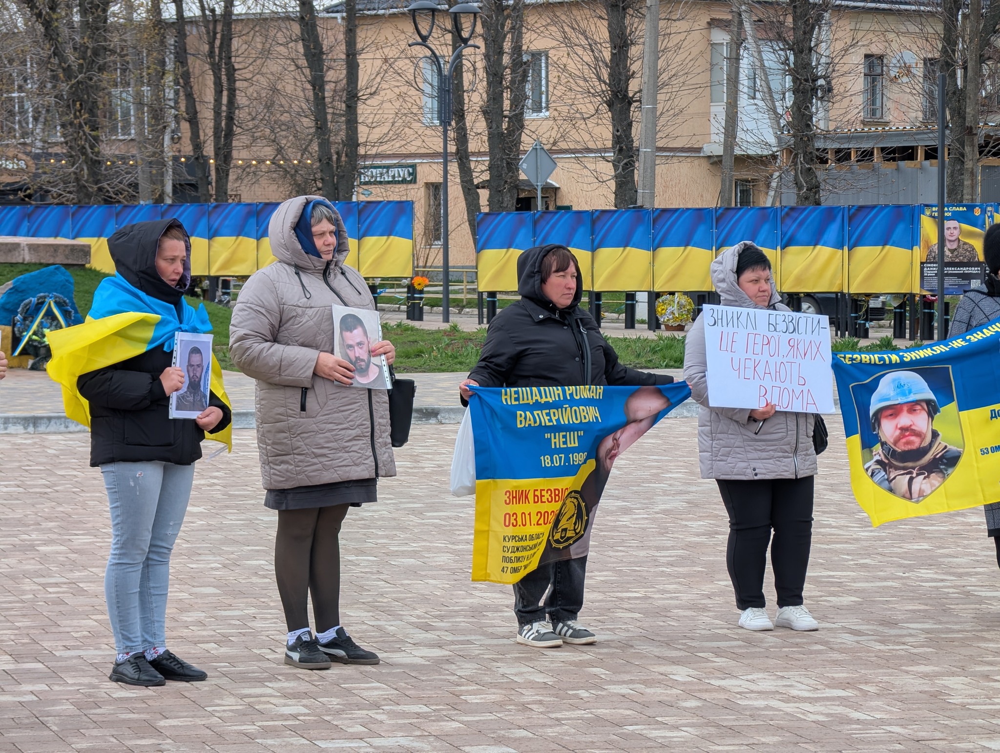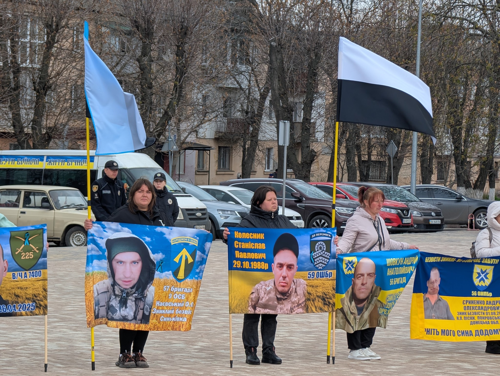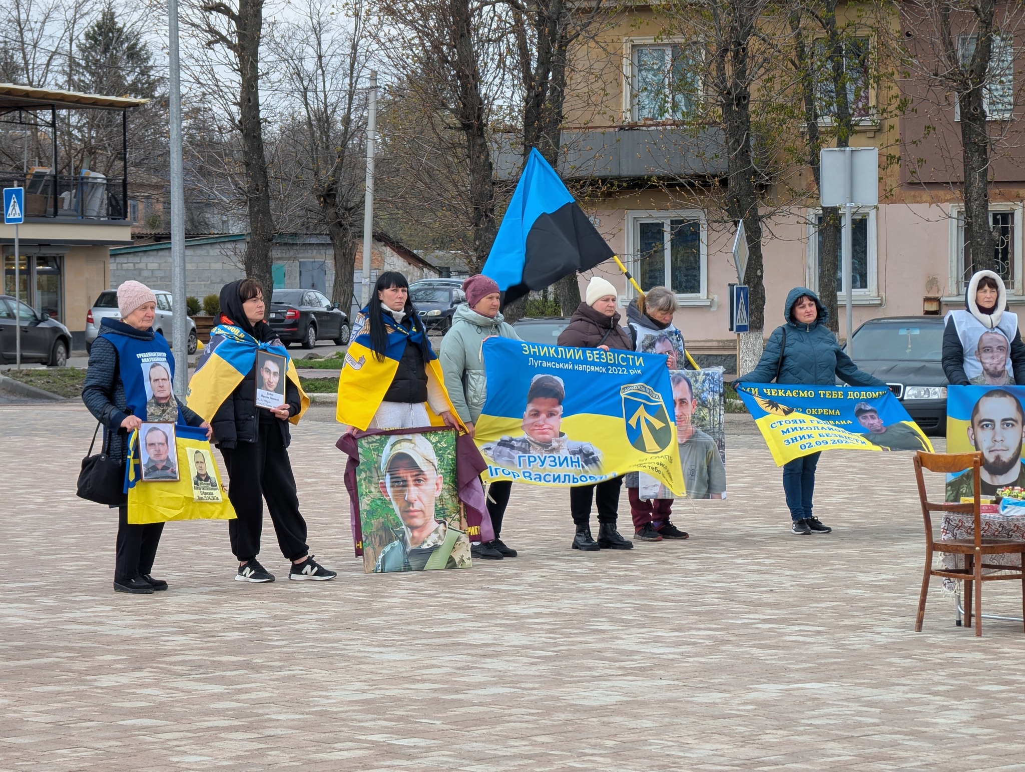 Учасники акції з банерами та портретами своїх рідних: синів, братів, чоловіків. На банерах – бойові підрозділи, дати, імена, а за кожним іменем – родина, яка чекає.