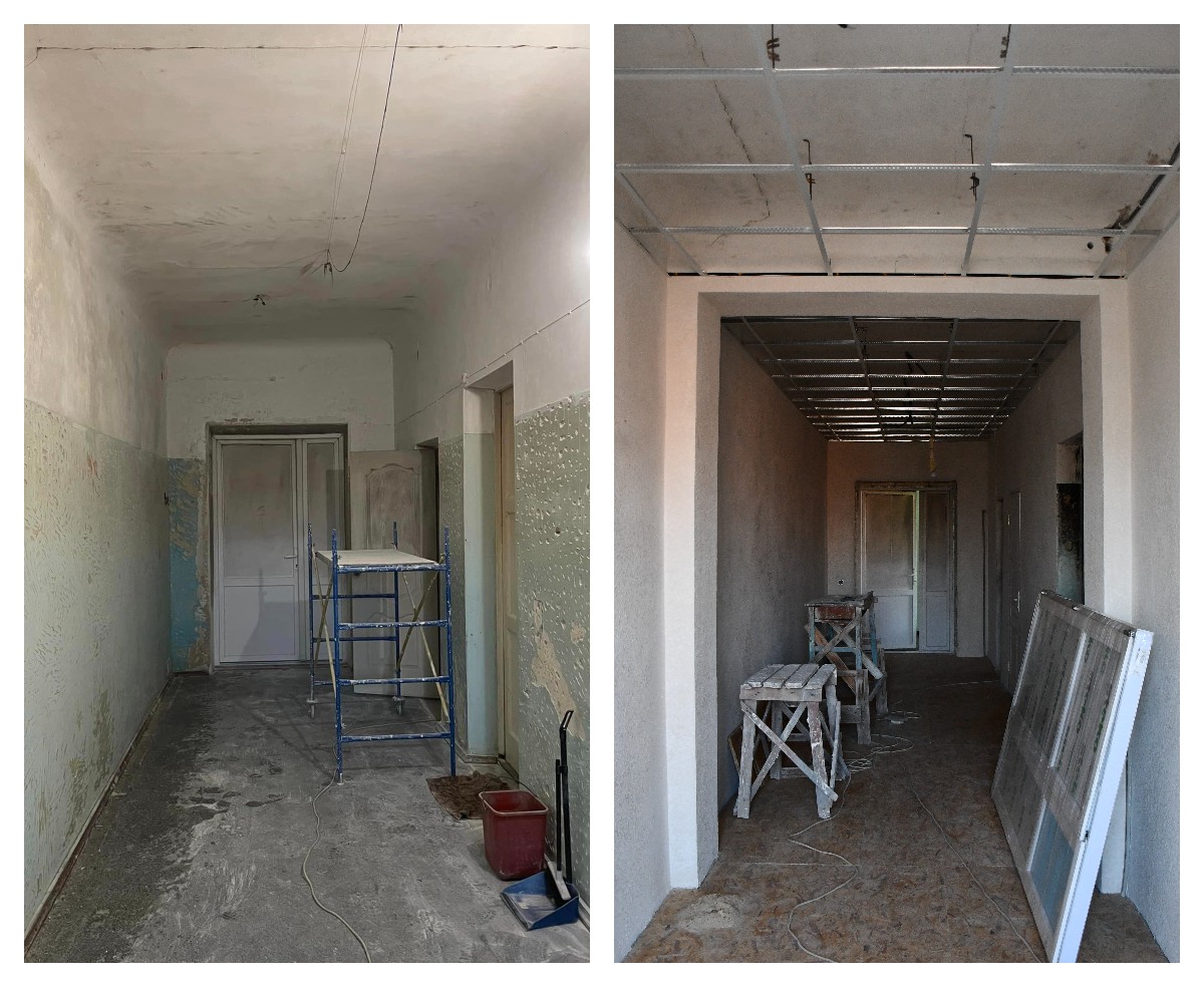 Наразі в коридорі прокладена нова електропроводка, завершилася підготовка стін до їх фарбування, підготовлена поверхня для настилу лінолеуму та кріплення металевих конструкцій для облаштування стелі. До встановлення готові металопластикові двері, також заміні підлягають деякі металопластикові вікна.