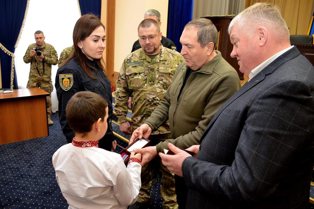 Зокрема медаль «Захиснику Вітчизни», якою відзначено посмертно загиблого старшого лейтенанта Владислава Фесенка, отримали його вдова Наталія Фесенко та син Нікіта. Медаль «Захиснику Вітчизни» вручили також вдові лейтенанта поліції Михайла Головіна Віті Головіній та їхнім дітям – 7-річному Михайлу та 4-річній Олесі.