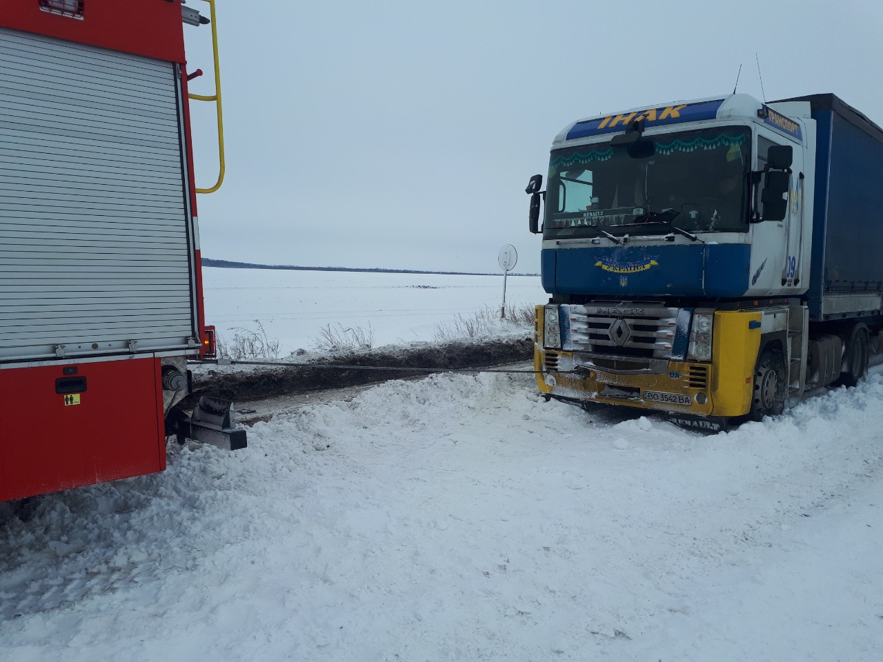 Наразi бiйцi пожежно-рятувальних пiдроздiлiв Управлiння ДСНС у Кiровоградськiй областi продовжують працювати на дорогах, визволяючи автомобiльний транспорт iз снiгових пасток.