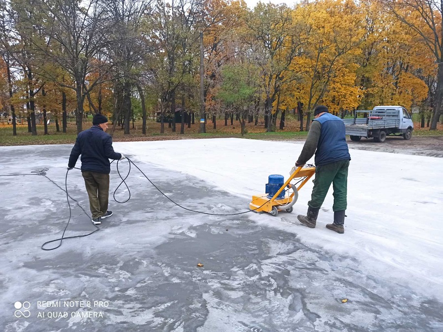 Учора, 9 листопада, було проведено вирівнювання поверхні майданчика шляхом шліфування верхнього шару бетону.