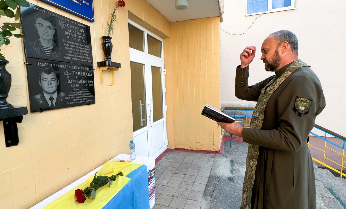 По закiнченню урочистостей, вiйськовий капелан священик Володимир освятив меморiальну дошку та вiдслужив лiтiю на могилi Андрiя Тарапаки.