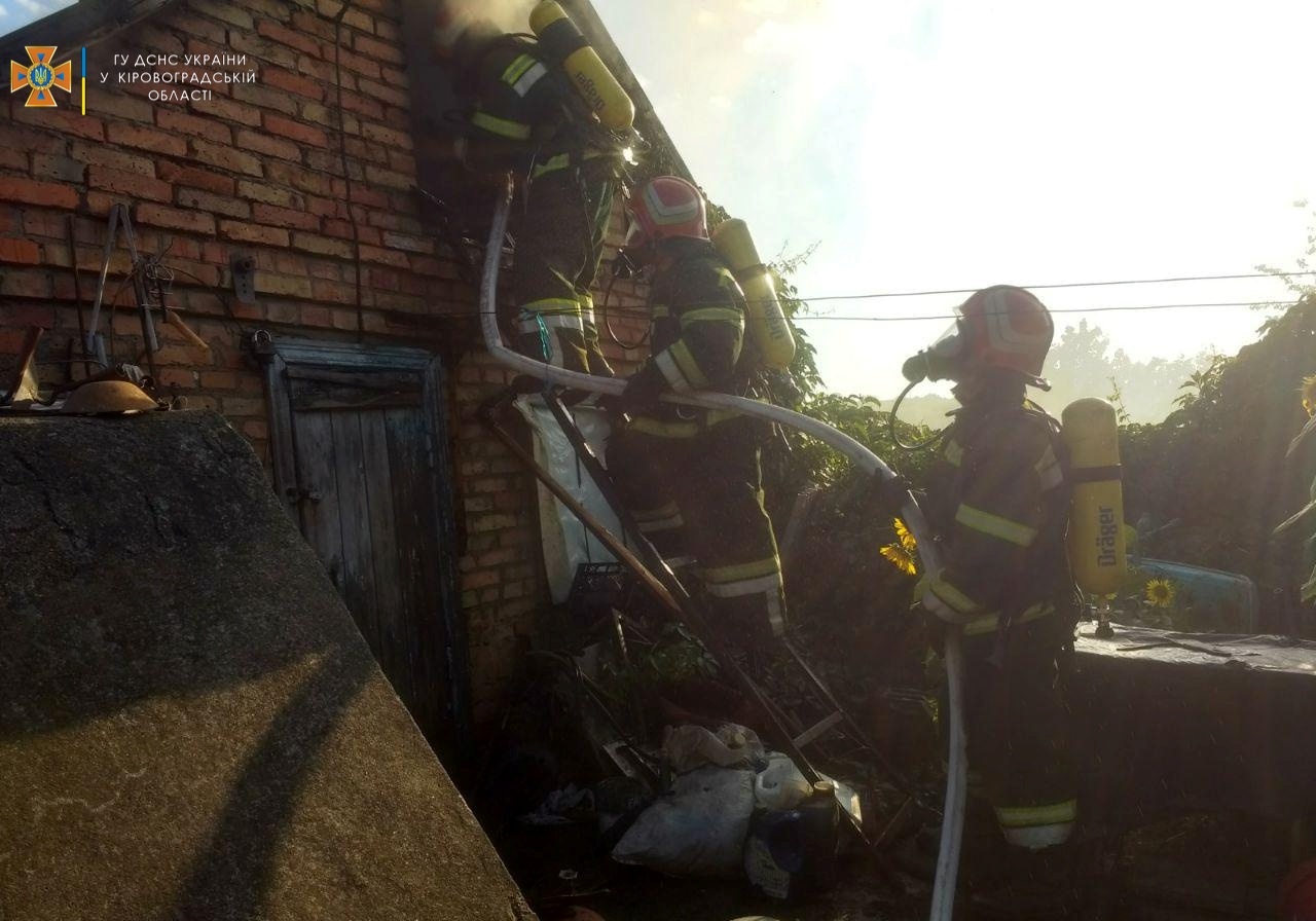 О 18:21 до Служби порятунку надiйшло повiдомлення про пожежу в м. Новоукраїнка. На момент прибуття пожежно-рятувального пiдроздiлу на територiї приватного домоволодiння на вул. Шмiдта горiла покрiвля господарчої будiвлi. О 20:10 силами двох вiддiлень служб займання було лiквiдоване.