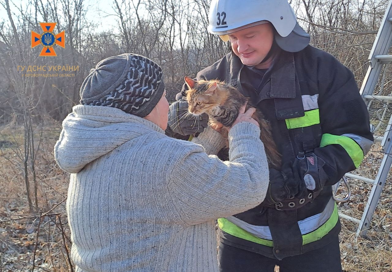 Рятувальники 32-ї пожежно-рятувальної частини за допомогою триколінної драбини дістали котика та передали стурбованій власниці.