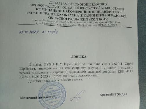 “Наразі Сергій перебува в реанімаційному відділенні обласної лікарні. Його стан стабільно тяжкий. У результаті аварії він отримав перелом ключиці, закритий перелом гомілкової кістки та відкритий перелом стегнової кістки, через що втратив понад два літра крові. Зараз Сергію необхідна операція, однак через сильний забій легенів, її поки зробити не можуть. Як нам сказали лікарі, на лікування Сергія необхідно багато коштів, мова йде про суму понад 300 тисяч гривень”, – розповідає сестра постраждалого Юлія Сухотіна.