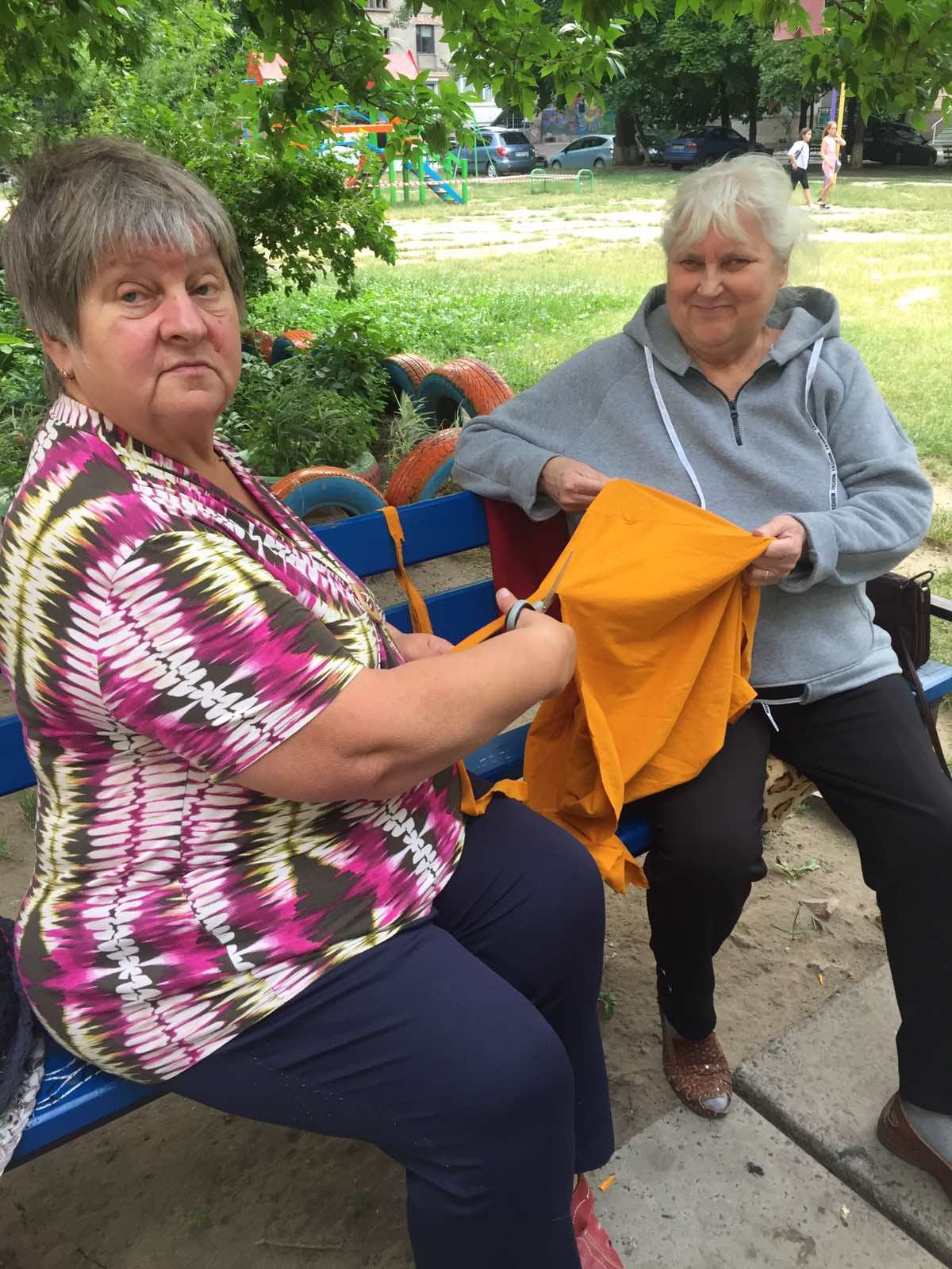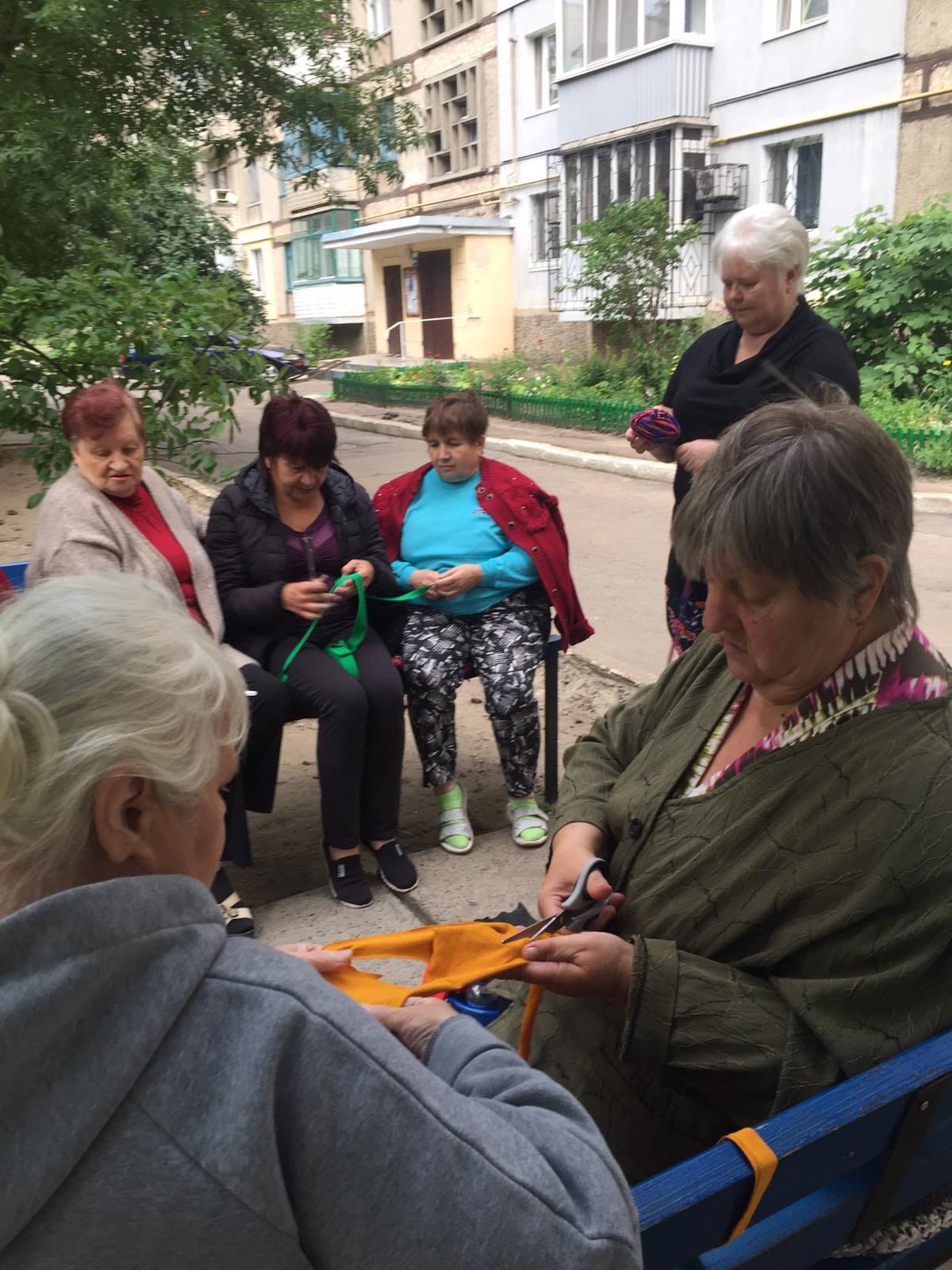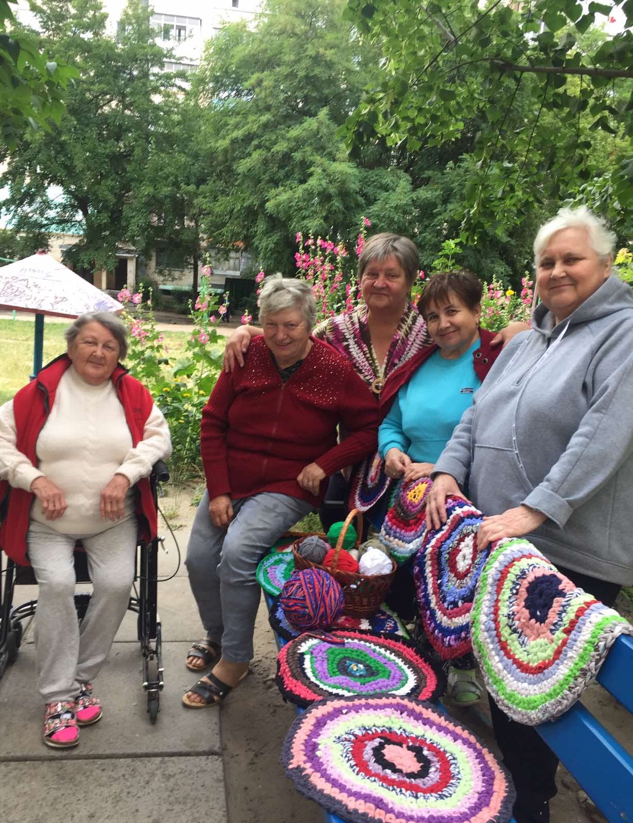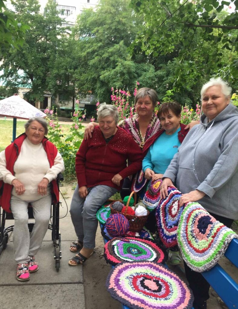 “Дівчатка “60+” з “Квадрат-104″ завзяті, працьовиті, активні долучилися до плетіння килимків для ЗСУ. Працюють без вихідних та святкових днів. Одні ріжуть, другі мотають клубочки, інші в’яжуть. Матеріали по можливості зносять мешканці будинку. На їх рахунку вже 51 коврик, Налаштовані позитивно бо ж розуміють, що тільки спільними зусиллями ми переможемо!”