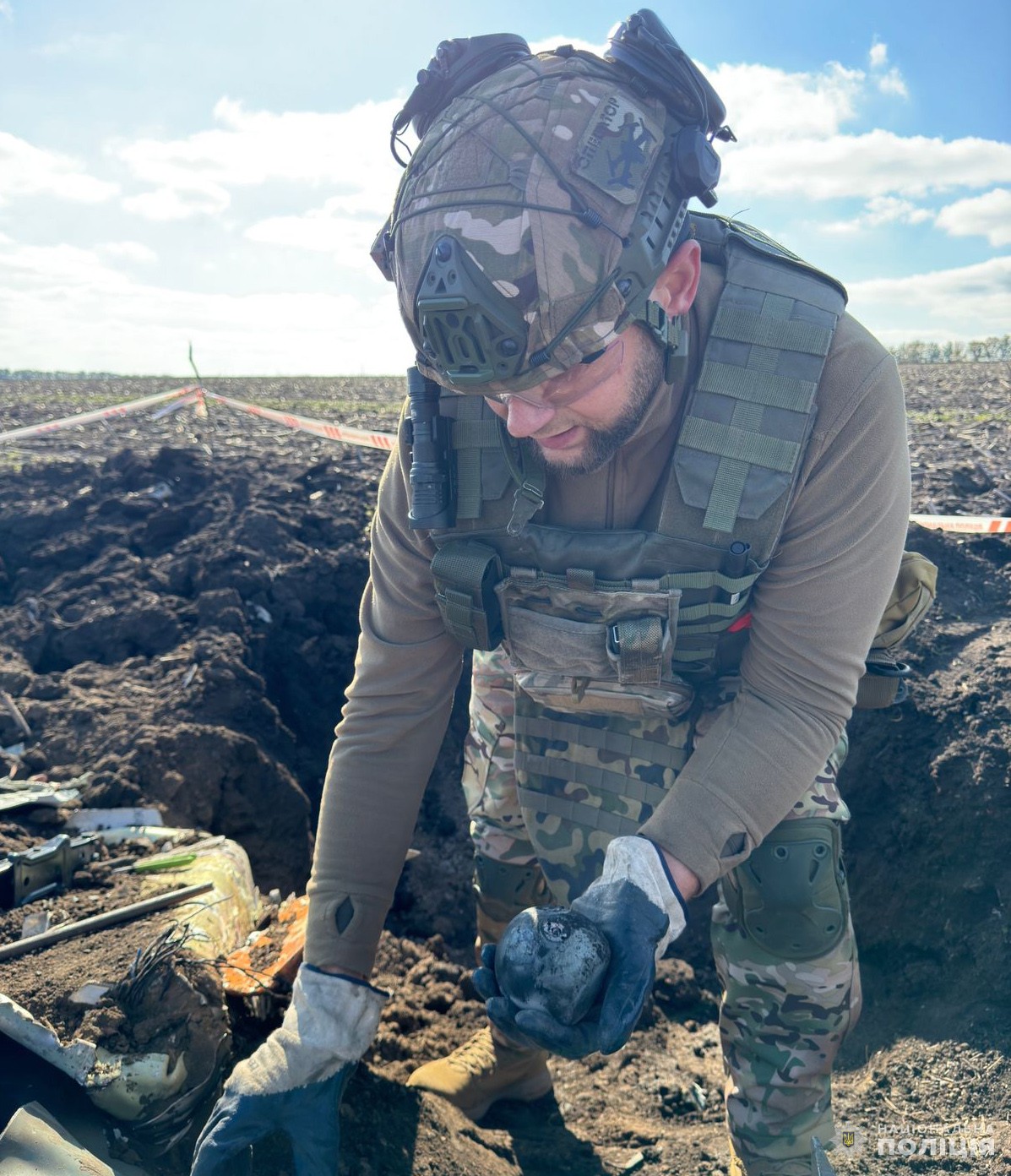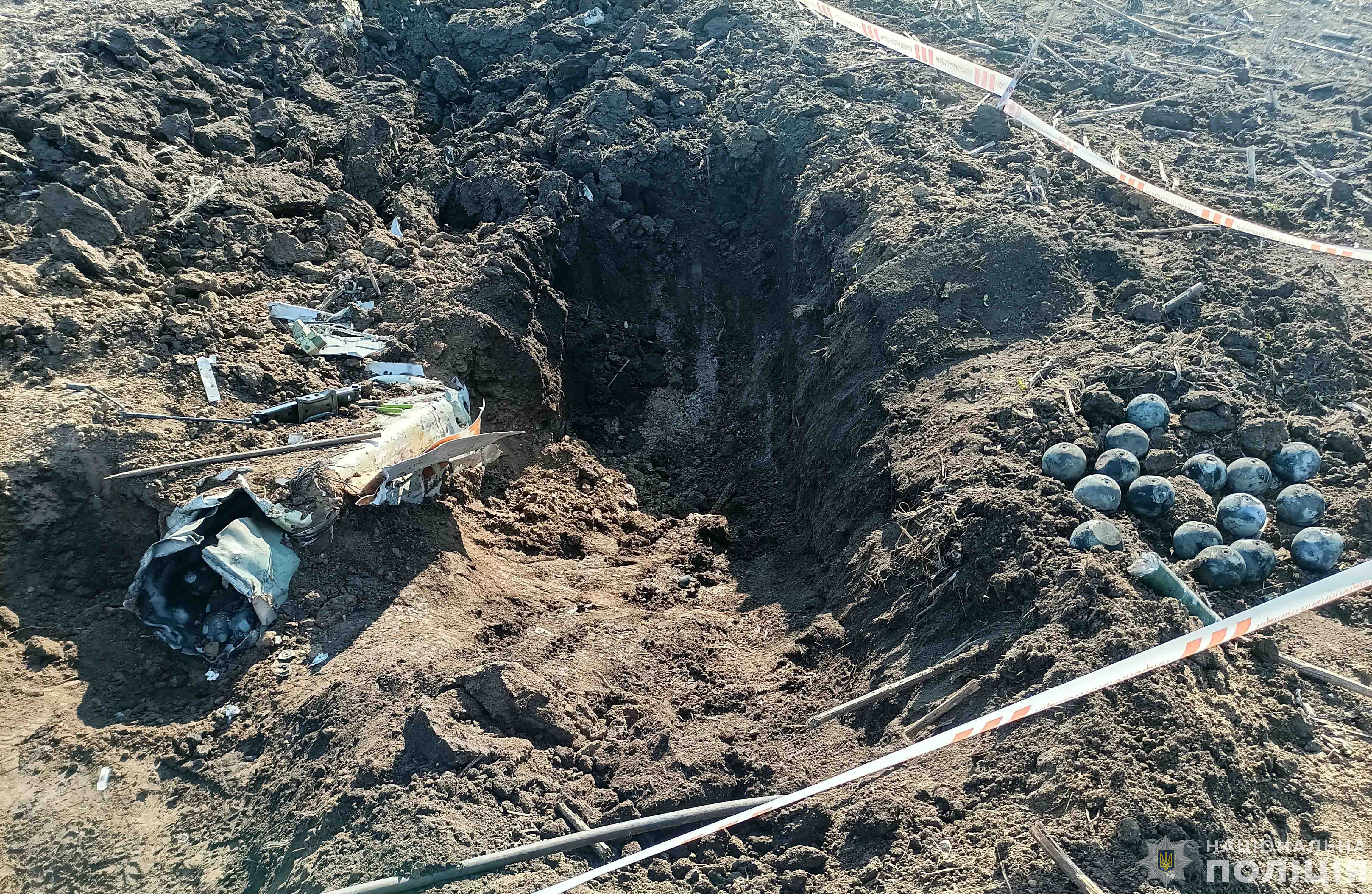 Оглядаючи територію, під шаром ґрунту виявили касетну бойову частину ракети, яку знищили методом контрольованого підриву на місці з дотриманням усіх норм безпеки.