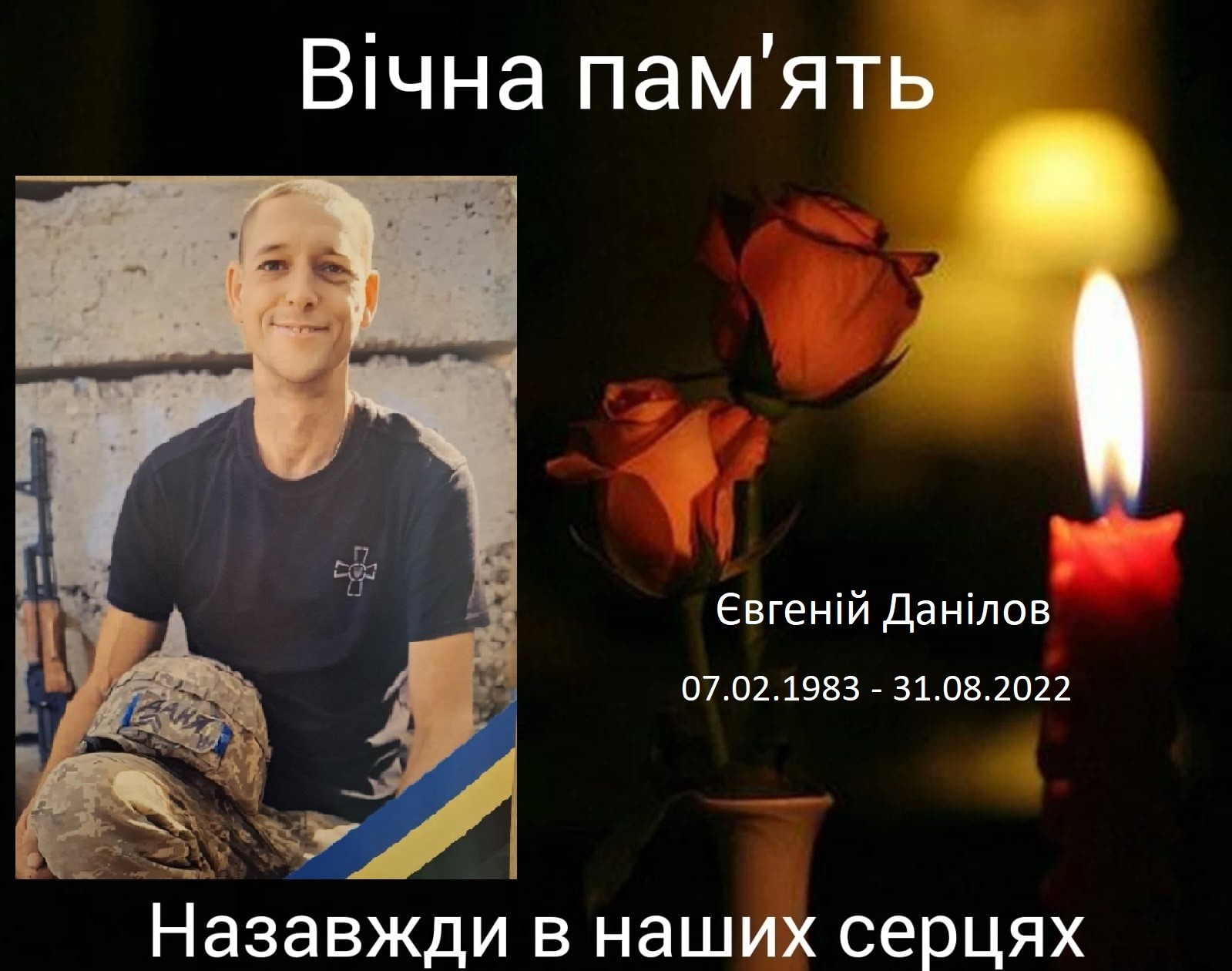 Молодший сержант 39-річний Євгеній Данілов загинув 31 серпня 2022 року поблизу села Піски Донецької області під час оборони України і захисту населення та інтересів держави у зв’язку з військовою агресією російської федерації проти України. Довгий час вважався зниклим безвісти.