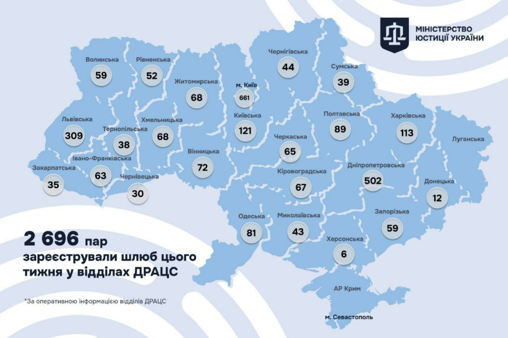 За минулий тиждень в Україні було зареєстровано 2 696 шлюбів.