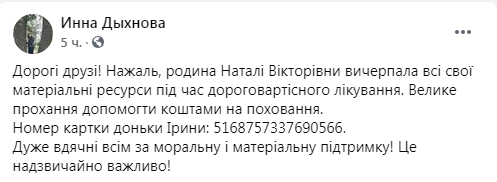 “Дорогi друзi! Нажаль, родина Наталi Вiкторiвни вичерпала всi свої матерiальнi ресурси пiд час дороговартiсного лiкування. Велике прохання допомогти коштами на поховання”, – пишуть колеги пані Наталії.