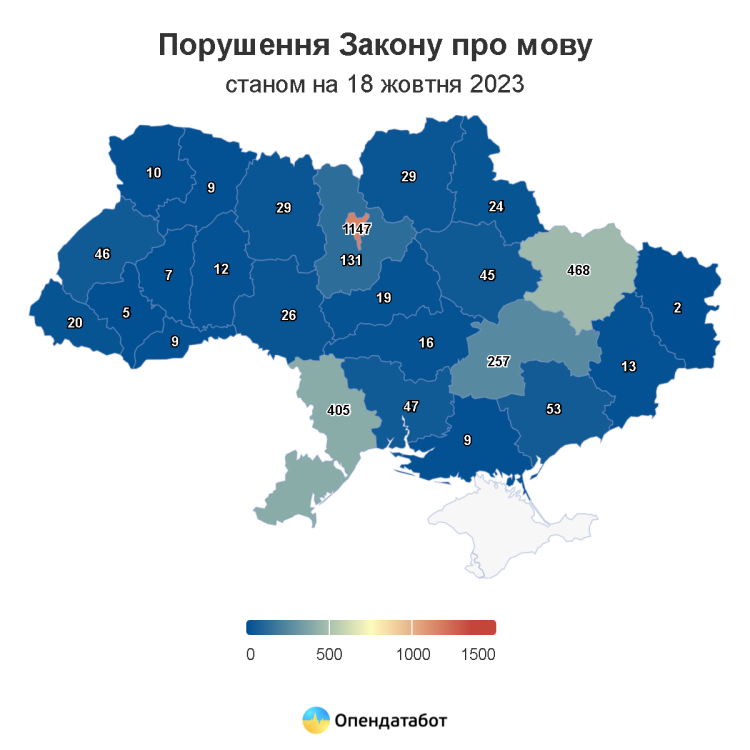 Загалом з сiчня по жовтень 2023 року до Уповноваженого iз захисту державної мови надiйшло 3015 звернень вiд громадян щодо порушень мовного закону. Це на 4% бiльше порiвняно з вiдповiдним перiодом 2021 року: тодi було зафiксовано 2895 звернень.
