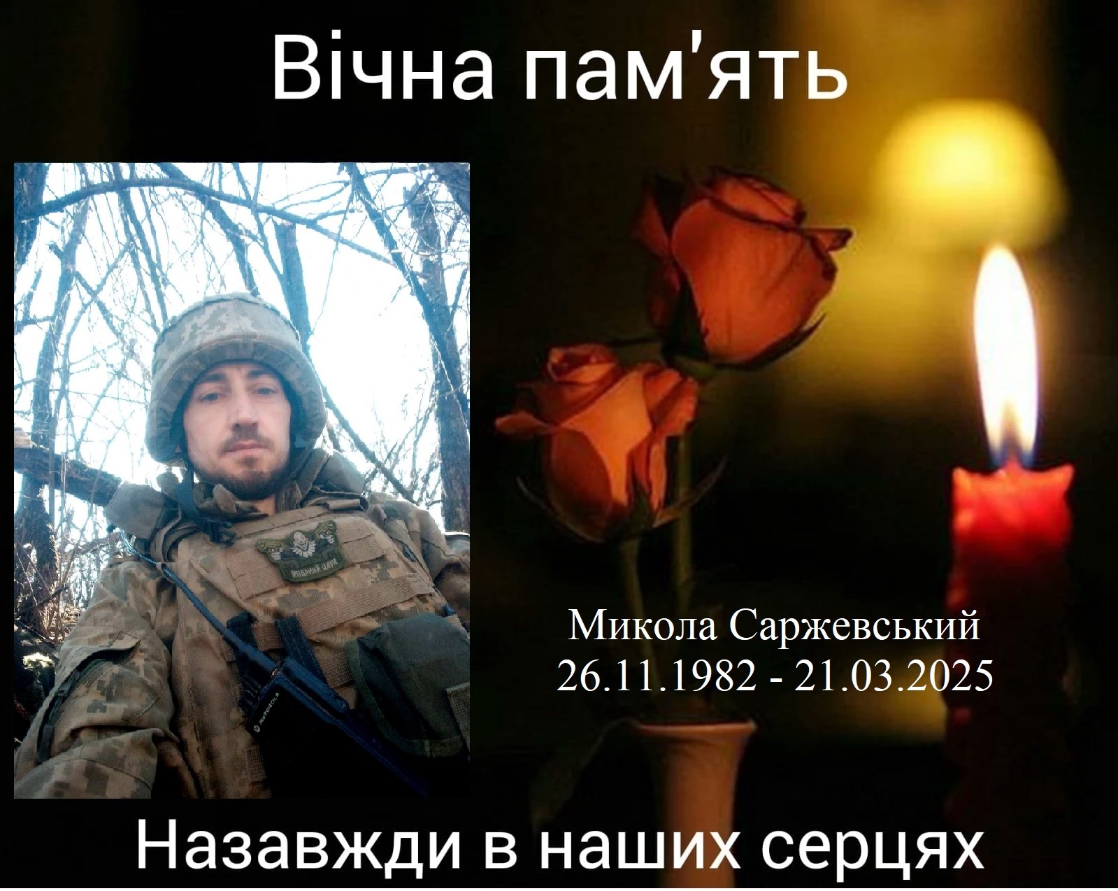 Солдат, 42 – рiчний Микола Саржевський прийняв свiй останнiй бiй 21 березня 2025 року, зупиняючи росiйських окупантiв в районi населеного пункту Бiлогорiвка, Сiверськодонецького району Луганської областi.