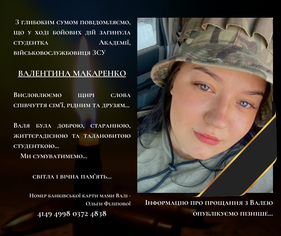 “Я досi не можу в це повiрити… Валентина Макаренко. Валя, моя подруга, одногрупниця, не так давно ми вiдганяли машини на схiд, ти дiлилась планами на майбутнє про те, як сильно ти хотiла вiдкрити свою студiю та викладати там вокал, писати пiснi й творити, розвивати нашу культуру. Неймовiрна вокалiстка з неймовiрним голосом, ти могла заспiвати все!” – написав хлопець.