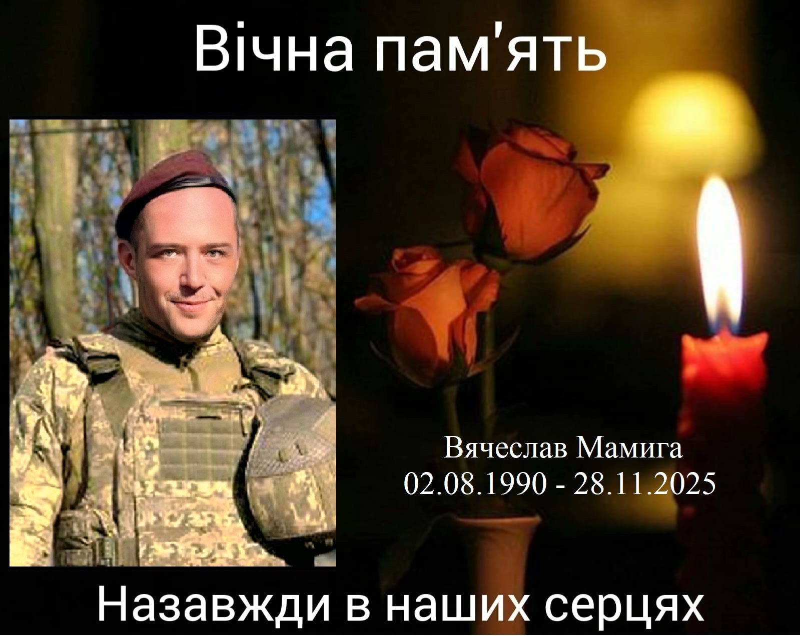 Солдат Вячеслав Мамига, водiй мiнометного взводу, загинув, 28 листопада 2025 року, зупиняючи росiйських агресорiв поблизу села Нова Круглянiвка Iзюмського району Харкiвської областi.