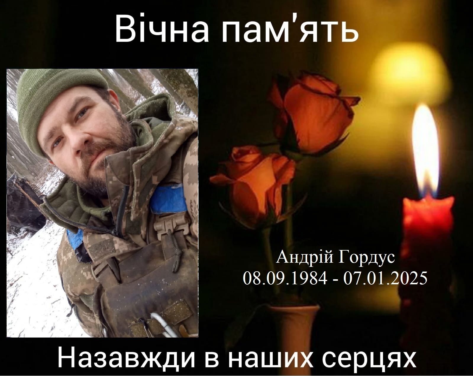 Старший сержант Андрiй Гордус, командир механiзованого вiддiлення, загинув 07 сiчня 2025 року, виконуючи свiй вiйськовий обов’язок в районi населеного пункту Колмаков Курської областi.