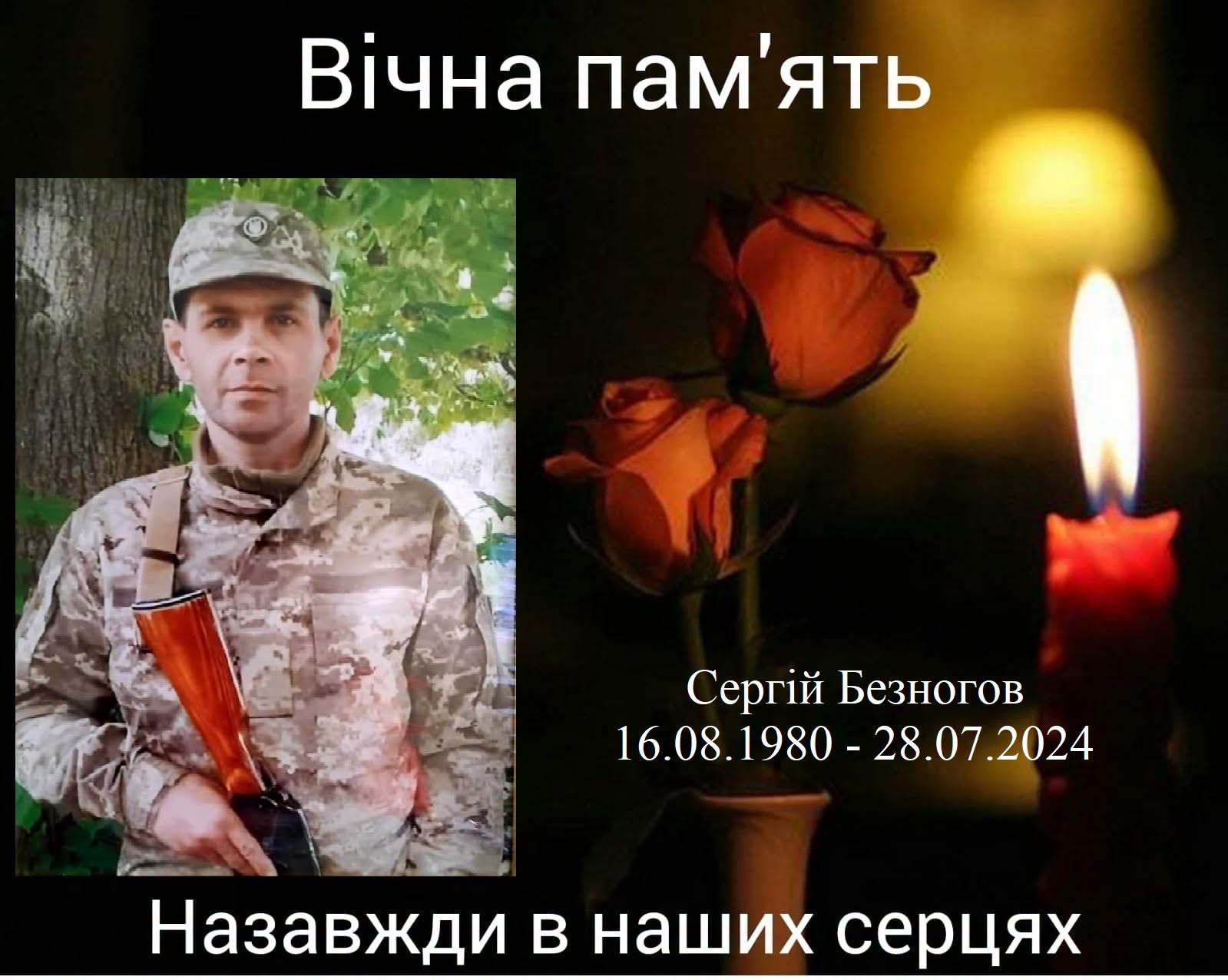 Солдат Сергій Безногов народився 16 серпня 1980 року. Гранатометник штурмового відділення вважався зниклим безвісти. Вірний Військовій присязі, мужньо виконуючи військовий обов’язок, загинув 28 липня 2024 року під час бойових дій у районі населеного пункту Новоселівка Перша Покровського району Донецької області.