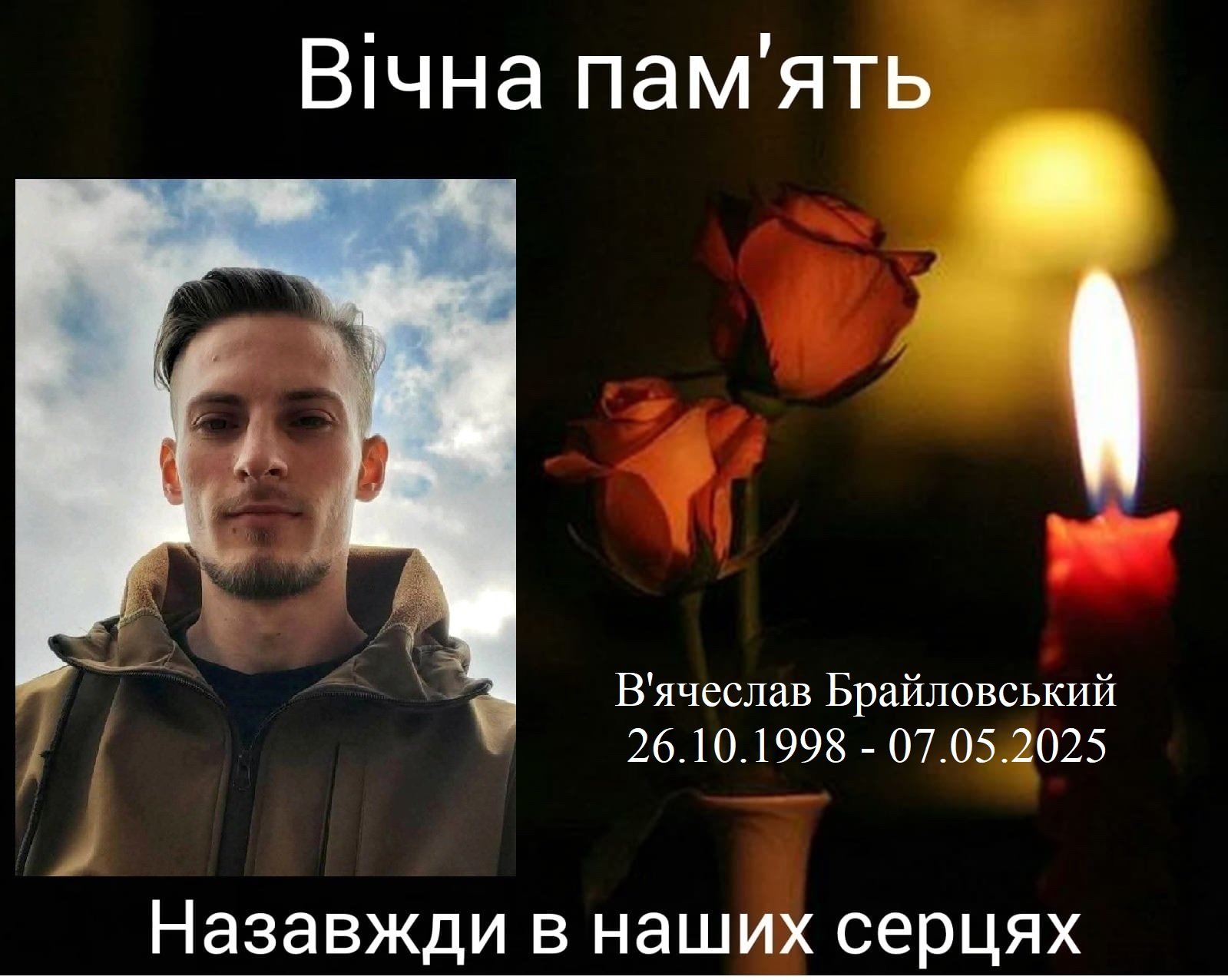 Молодший сержант В’ячеслав Брайловський, 1998 року народження, кулеметник самохідного артилерійського взводу, загинув 07 травня 2025 року поблизу населеного пункту Храпівщина Сумської області.