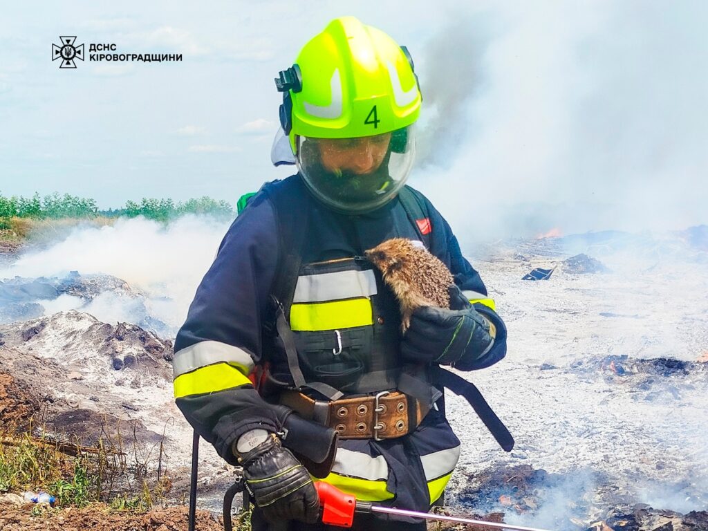 Пiд час гасiння пожежi смiття бiля села Вiльне Соколiвської громади нашi вогнеборцi виявили серед диму й вогню маленьке створiння, яке не могло втекти — наляканого їжачка.
