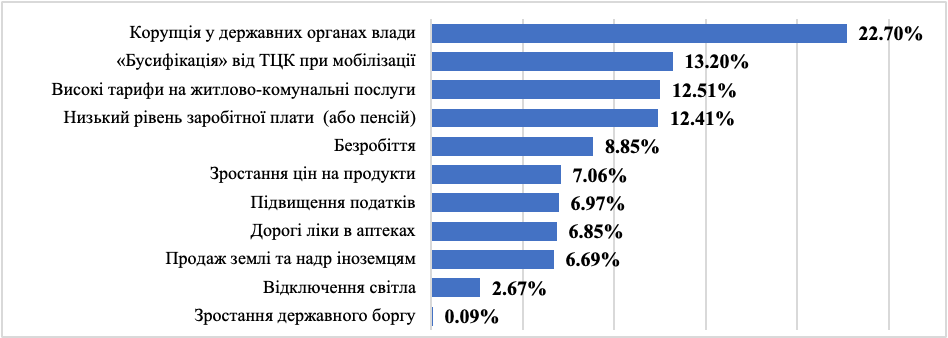 Серед проблем, які найбільше турбують респондентів окрім війни як такої, перші місця займають корупція (22,70 %), насильницька мобілізація-«бусифікація» (13,20 %), високі комунальні тарифи (12,51 %), низький рівень зарплат і пенсій (12,41 %).