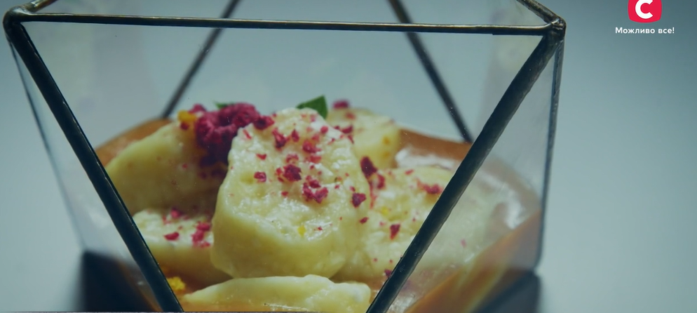 Дівчина приготувала ліниві вареники з персико-апельсиновим кюлі, з додаванням м’яти та сублімованої малини.