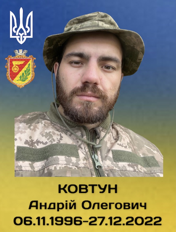 Завершив свiй земний шлях 26-рiчний солдат зi Знам’янської громади Андрiй Олегович Ковтун. Вiн загинув 27.12.2022 року, пiд час виконання бойового завдання в районi населеного пункту Красногорiвка, Донецької областi.