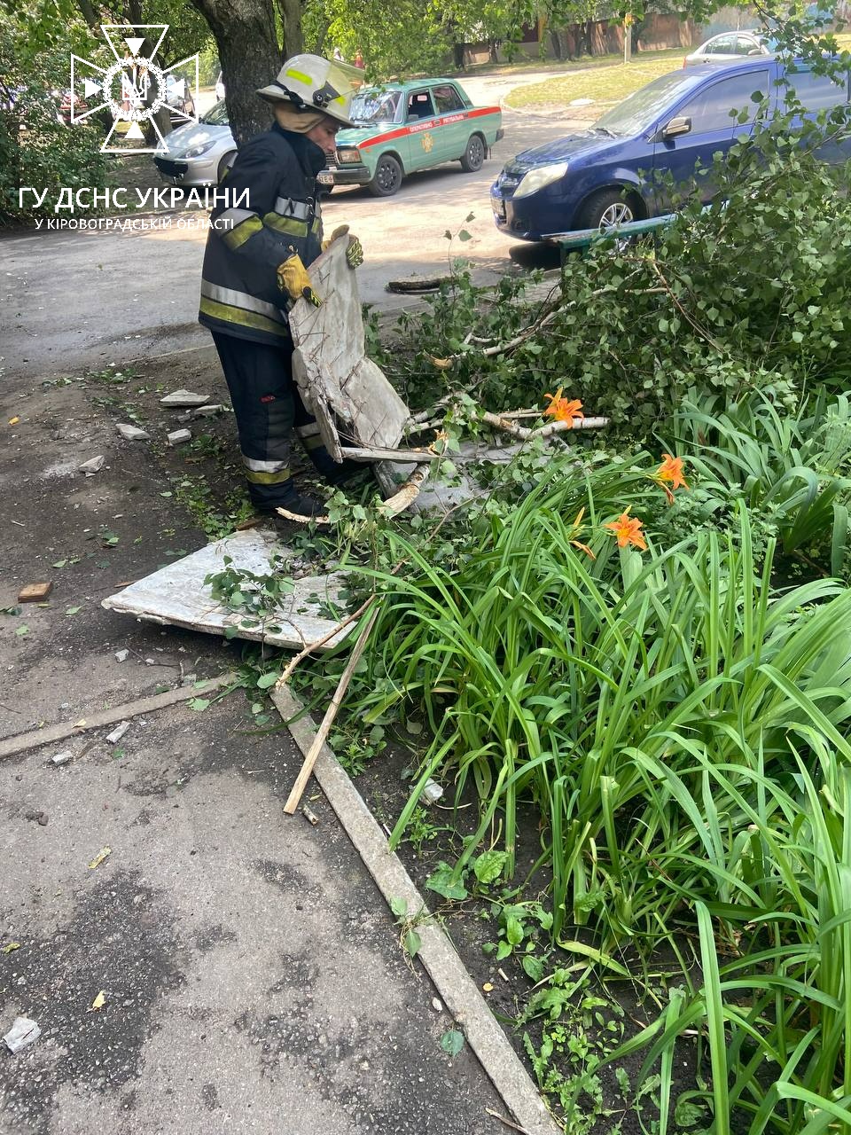 На вул. Героїв України у м. Кропивницькому пiдроздiлом 2-ої пожежно-рятувальної частини надано допомогу по вилученню елементiв оздоблення балкону, якi впали та застрягли на деревi.