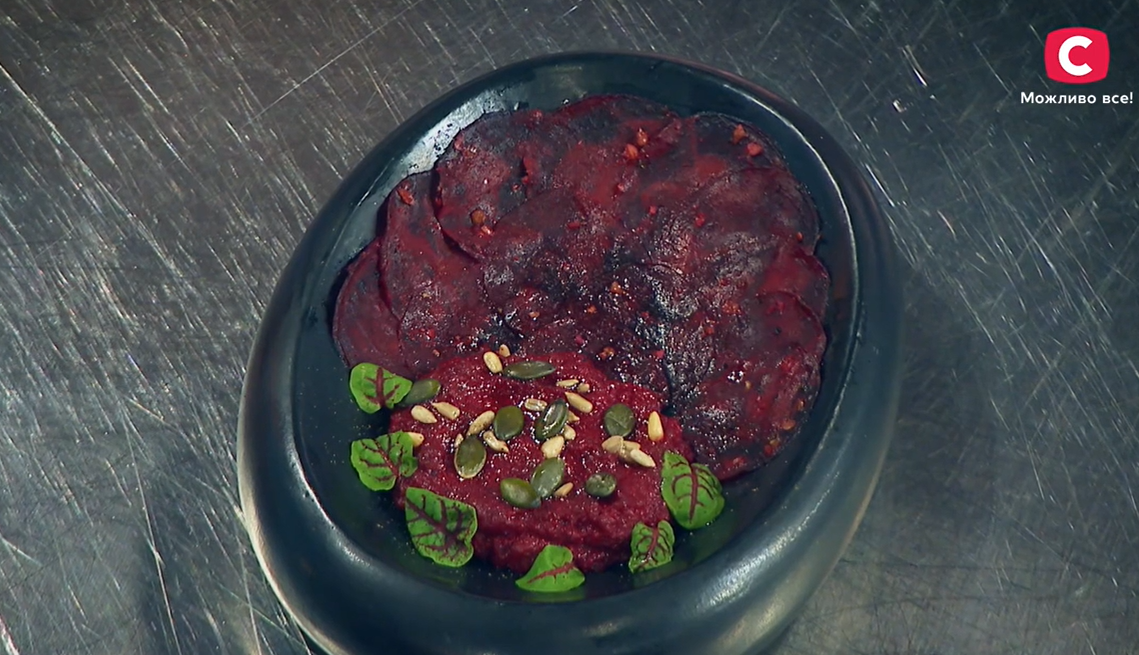 Євген приготував карпачо під маринадом з олії чілі, розмарином і білим перцем та хумусом на основі запеченого буряку.