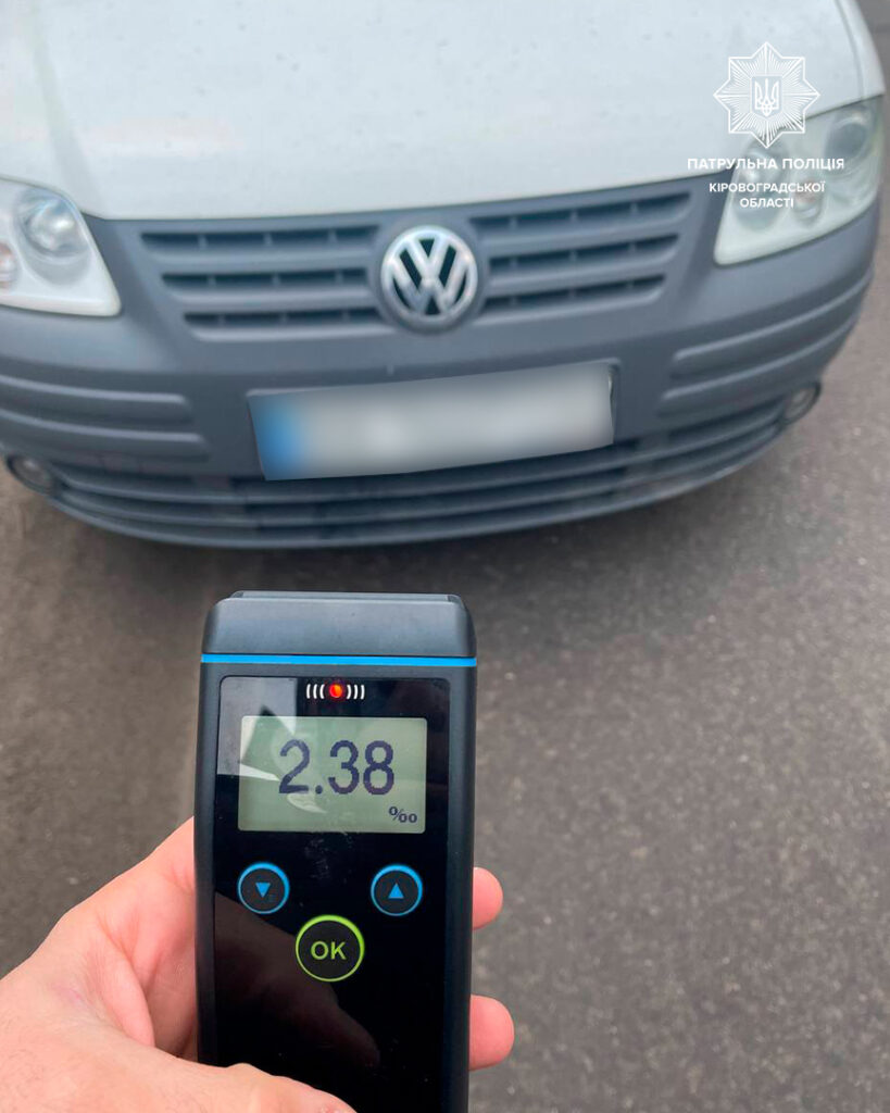 Пiд час встановлення обставин подiї iнспектори виявили у водiя ознаки алкогольного сп’янiння. Результат приладу Драгер — 2,38 промiле. Це майже у 12 разiв бiльше допустимої норми.