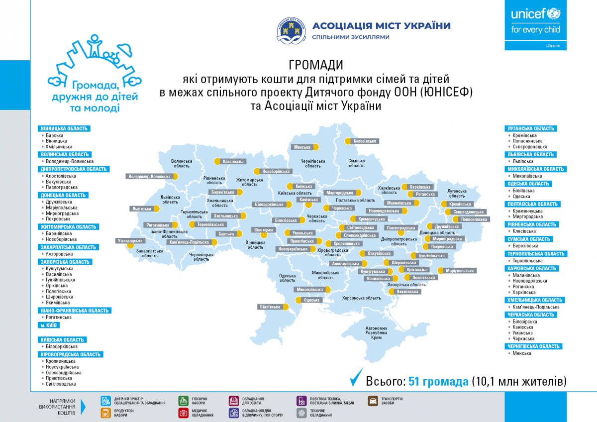 Кропивницька, Новоукраїнська, Олександрiйська, Приютiвська та Свiтловодська громади увiйшли до перелiку 51 територiї, якi завдяки спiвпрацi ЮНIСЕФ та Асоцiацiї мiст України отримають цiльове фiнансовання у розмiрi 50 тисяч доларiв США.