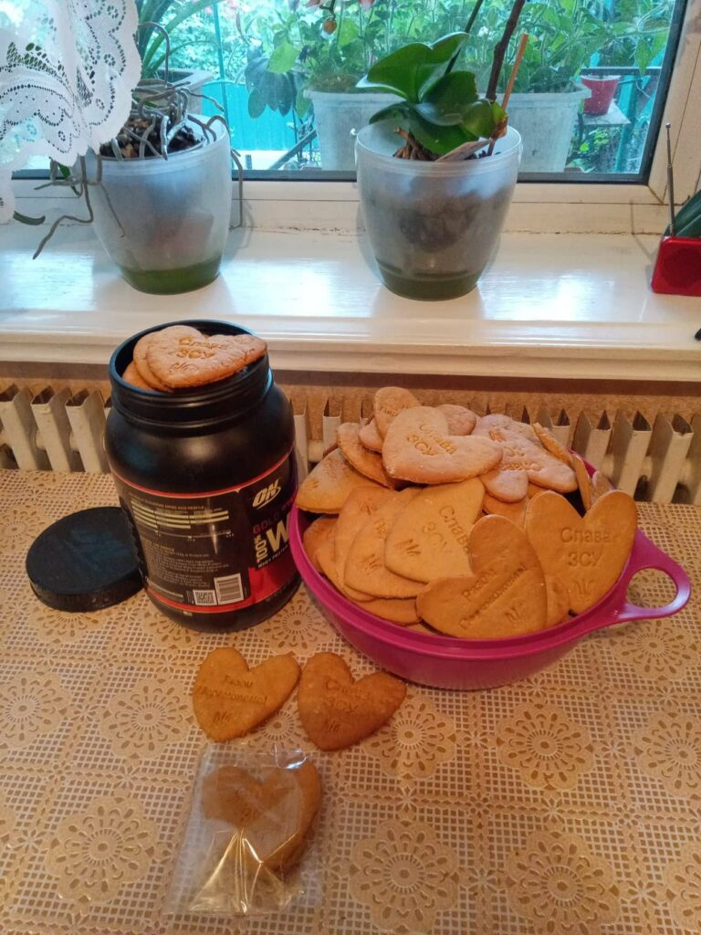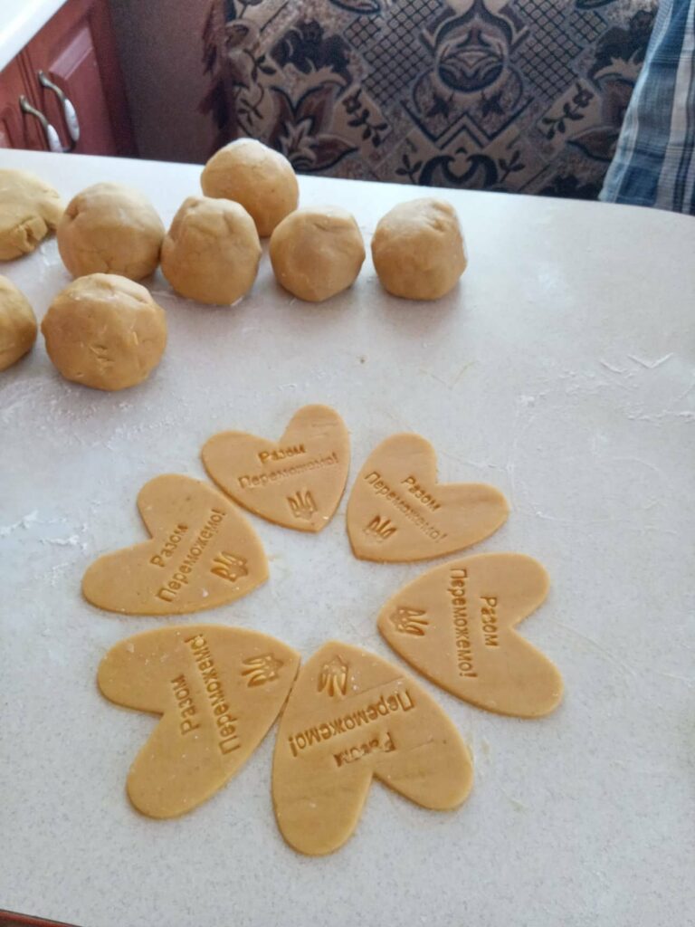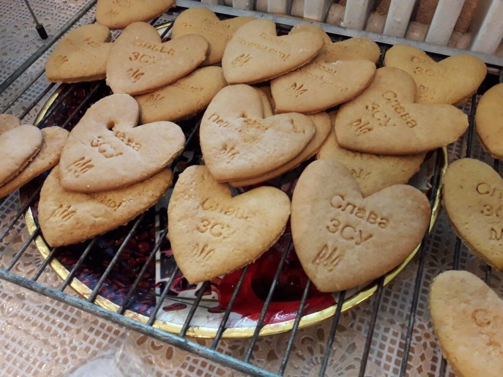 На виготовлення печива жінку надихнула подруга-волонтерка. Тож замовила через інтернет форму-сердечко та спеціальні написи. Маленький тризуб отримала як бонус.
