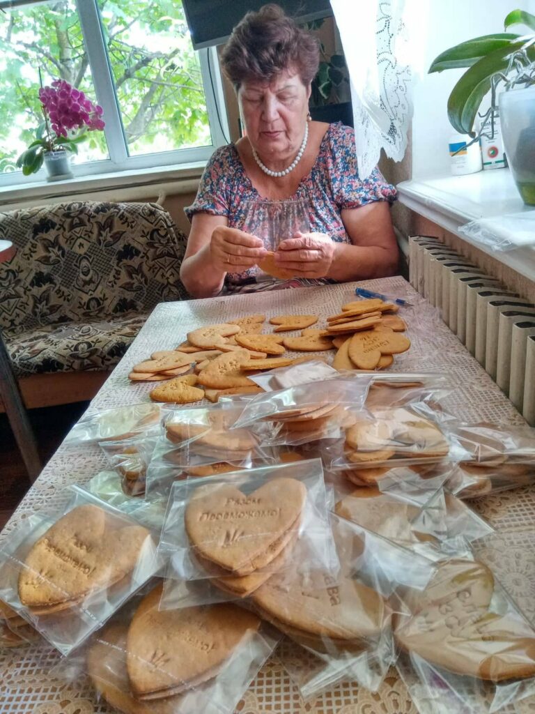Печиво Олександра Іванівна пакує у спеціальні пакетики по два штуки. На одному напис “Слава ЗСУ”, на іншому – “Разом переможемо!” Невдовзі з’являться ще середечки з написом: “З Україною в серці!”