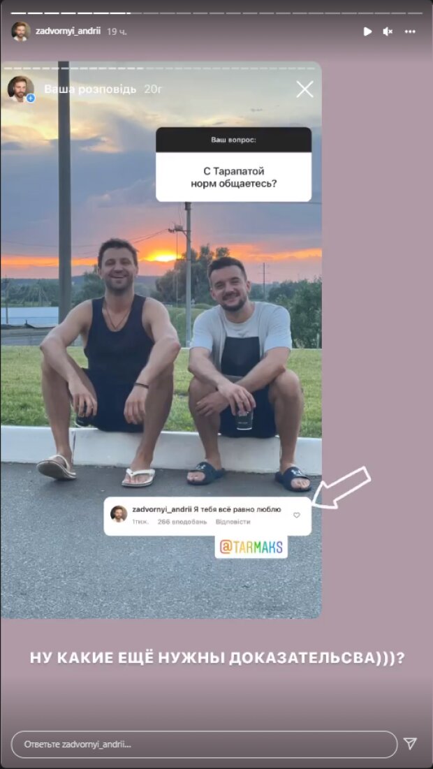 Пiсля цього, Андрiй навiв ще один “доказ” на користь того, що вiн гей – це його коментар у бiк Максима Тарапати пiсля його iнтрижки зi Златою. У Задворного запитали, чи досi вiн нормально спiлкується з Максом, а вiн показав коментар, в якому пише, що любить Тарапату.