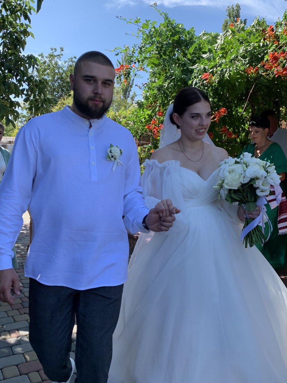 “Ми з чоловiком хотiли, щоб весiлля пройшло за народними традицiями, – розповiдає Олена Борисiвна, вчителька молодших класiв мiсцевої школи (а в минулому – завуч дошкiльного закладу). – Тому спершу було сватання, знайомство з батьками… I зять, i вся нова рiдня, як то кажуть, нашi люди. Ми добре порозумiлися з ними. Карбiвка, де гуляли весiлля, дуже сподобалася. Найбiльше тим, що в нiй всi будинки…цiлi. Слава богу, що хоч десь є села, якi живуть далеко вiд вiйни, куди не прилiтає!”