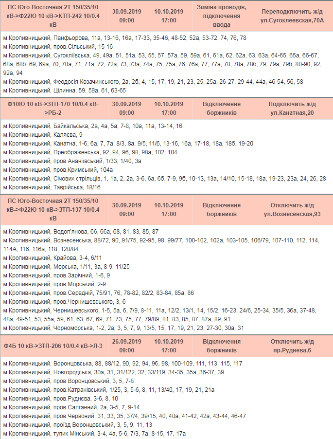 Відключення світла oчікується за наступними адресами: