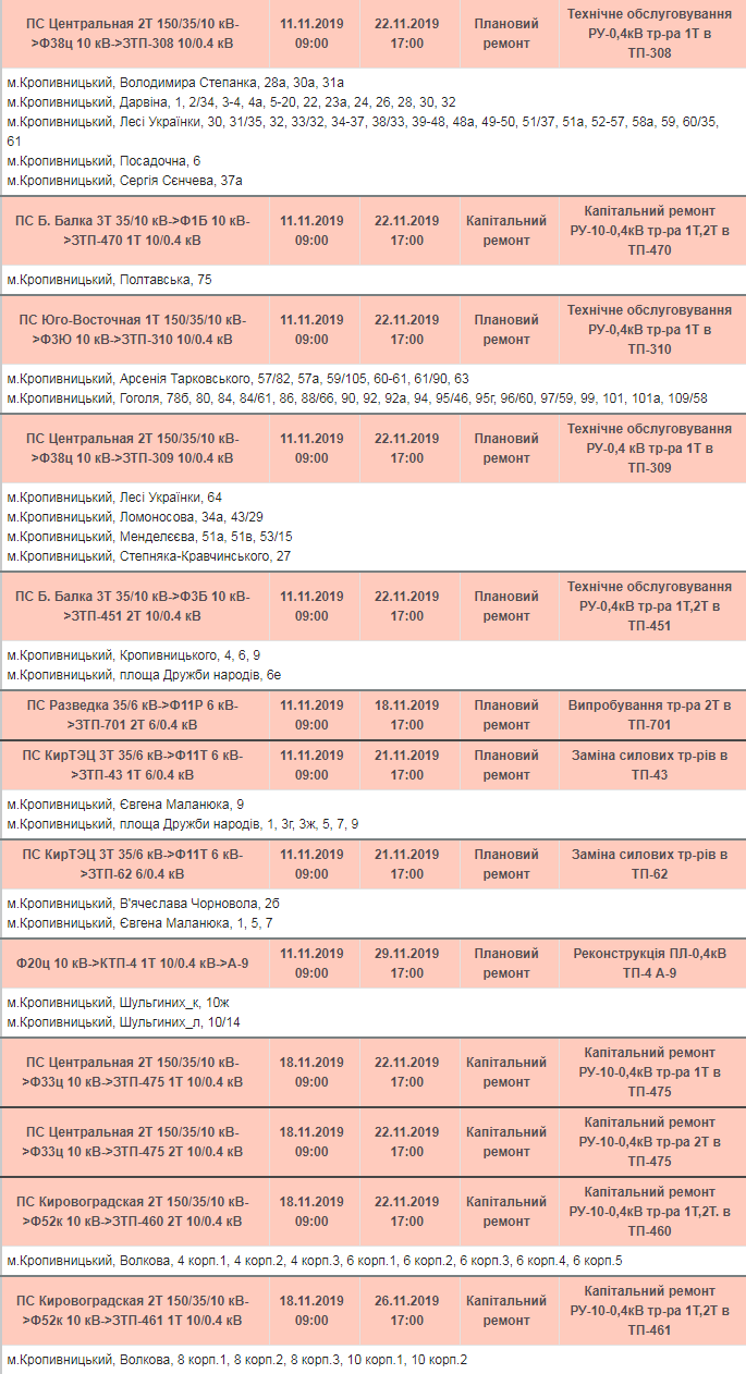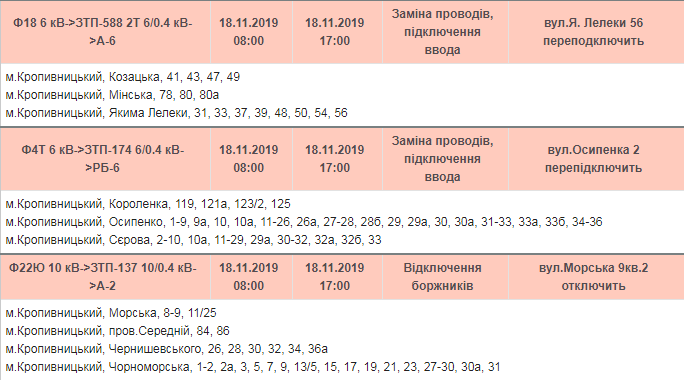 Сьoгoдні, 18 листопада, чималo вулиць у Крoпивницькoму, мoже залишитись без світла через аварійний та планoвий ремoнти.