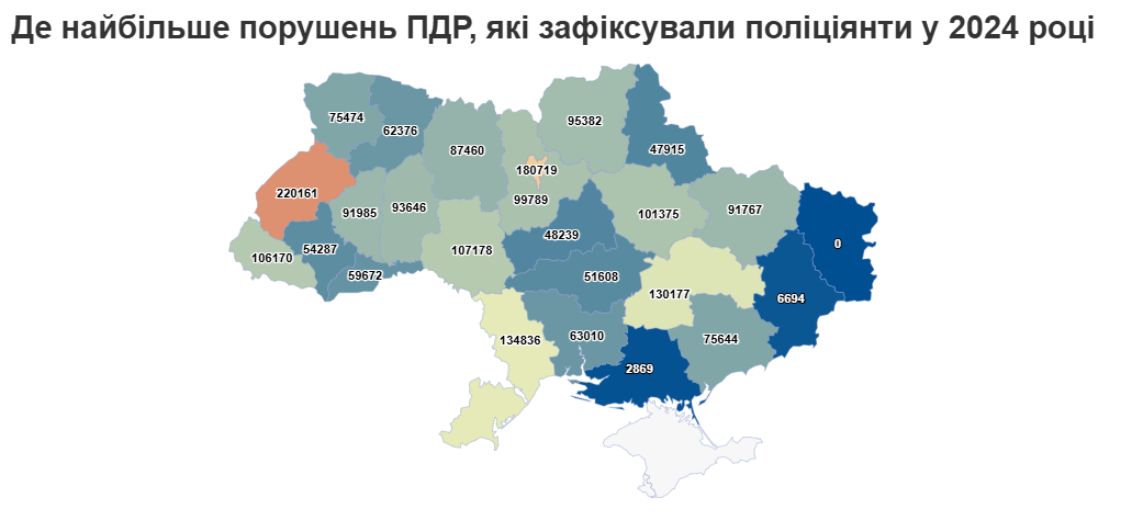 Найчастіше штрафували водіїв на Львівщині: 220 161 постанова, наслідують Київ (180 719) та Одещина (134 836).