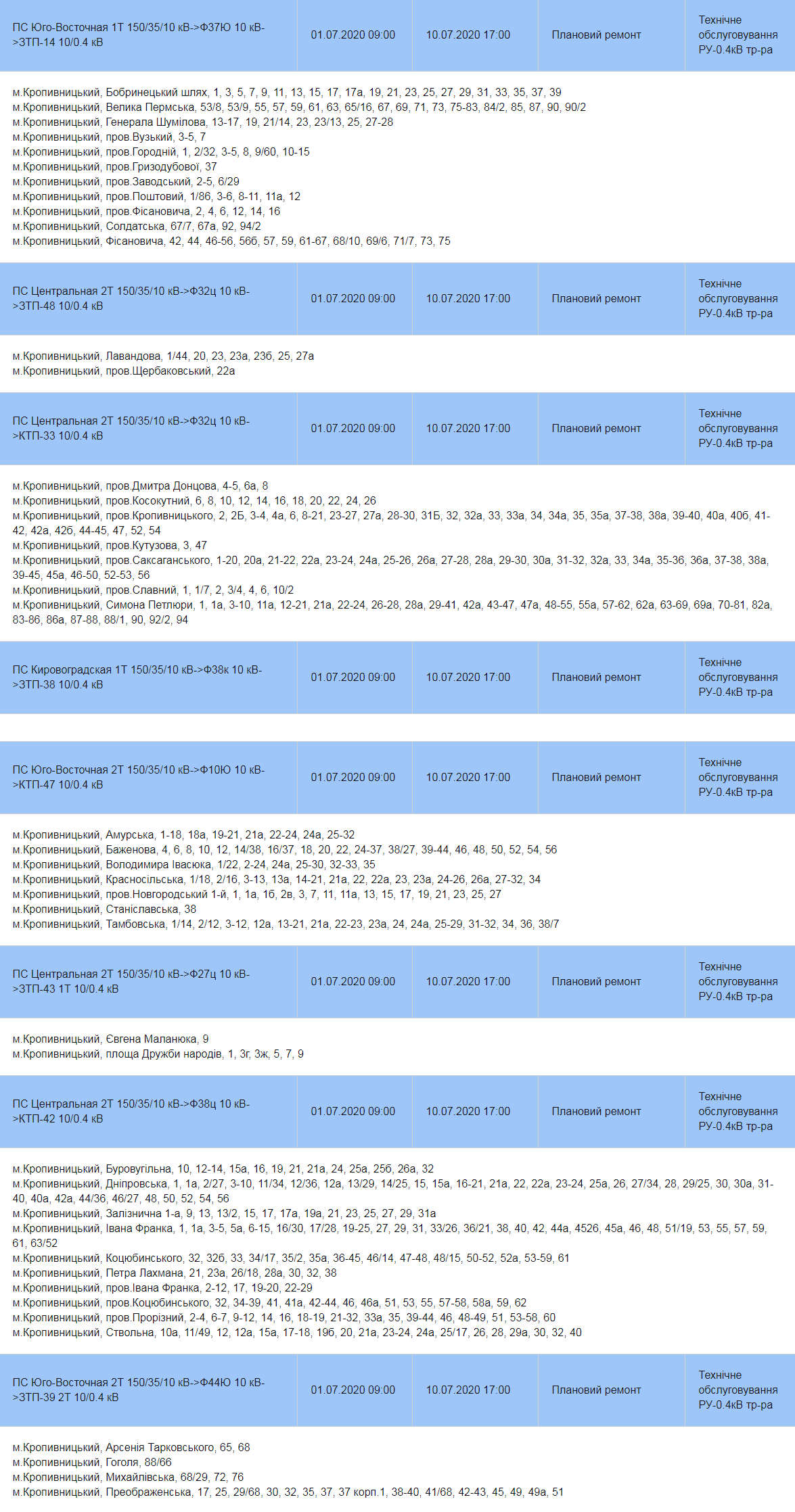 Сьогодні, 1 липня, низка вулиць у Кропивницькому, може залишитись без світла через аварійний та плановий ремонти.