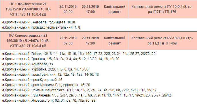 Сьогодні, 29 листопада, низка вулиць у Кропивницькому, може залишитись без світла через аварійний та плановий ремонти.
