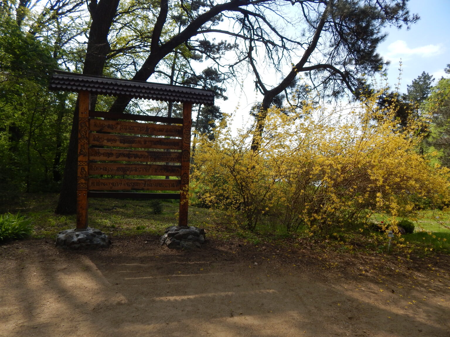 Золотими кулями вирiзняється форзицiя, яка уже мiсяць мiцно тримає квiти на тендiтних гiлочках, нiжнi квiти магонiї падуболистої приваблюють безлiч комах та бджiл, а метасеквоя прокинулася пiсля тривалого вiдпочинку i поруч iз сакурами створюють чудову бiогрупу. Церцис, айва японська, спiрея, барбариси доповнюють кольорову гамму весни на фонi тихої Боковеньки, яка доповнює чудову мiсцину, яку майже 130 рокiв тому створив Микола Львович Давидов. Це –Україна!