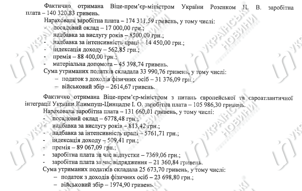 Згідно з ним, Розенку було нараховано за грудень 174 312 гривень, з них посадовий оклад становив 17 000 гривень, надбавка за вислугу років – 8 500 гривень, надбавка за інтенсивність праці – 14 450 гривень, індексація – 563 гривні, премія – 88 400 гривень, матеріальна допомога – 45 399 гривень.