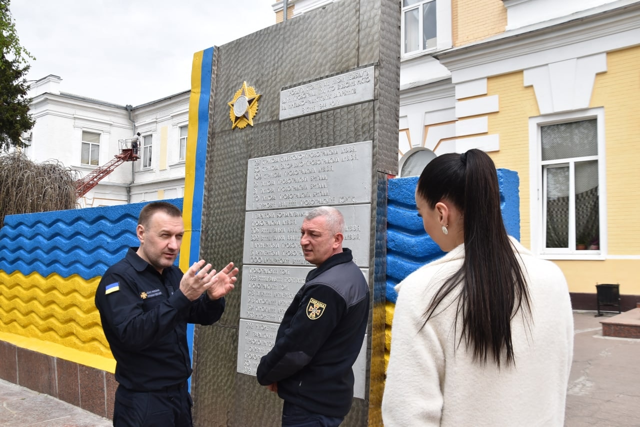 Рятувальники у Кропивницькому пофарбували стелу біля гарнізону у жовто-блакитні кольори.