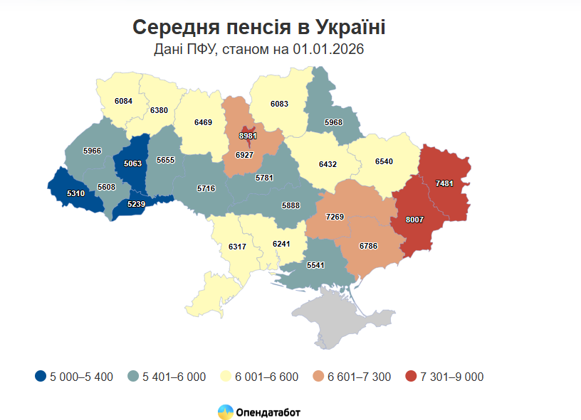 Найвища середня пенсiя — у Києвi (майже 9 000 грн), найнижча — на Тернопiльщинi (близько 5 000 грн).