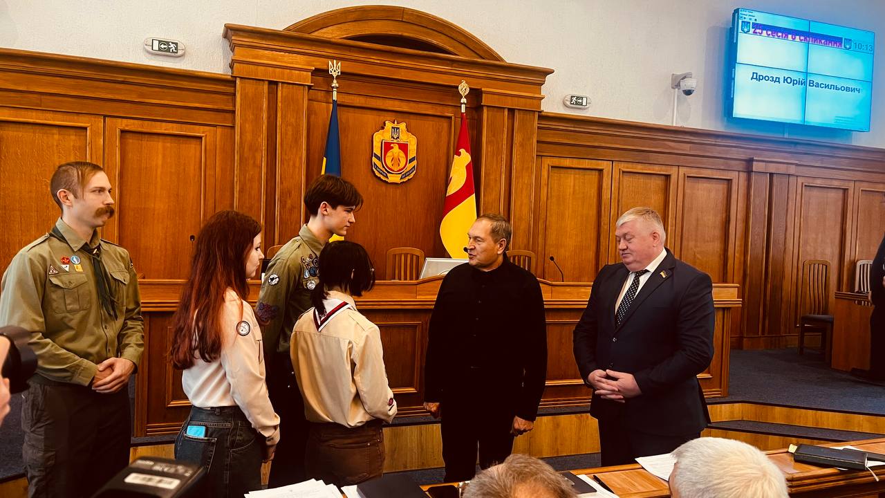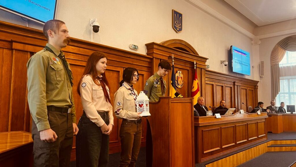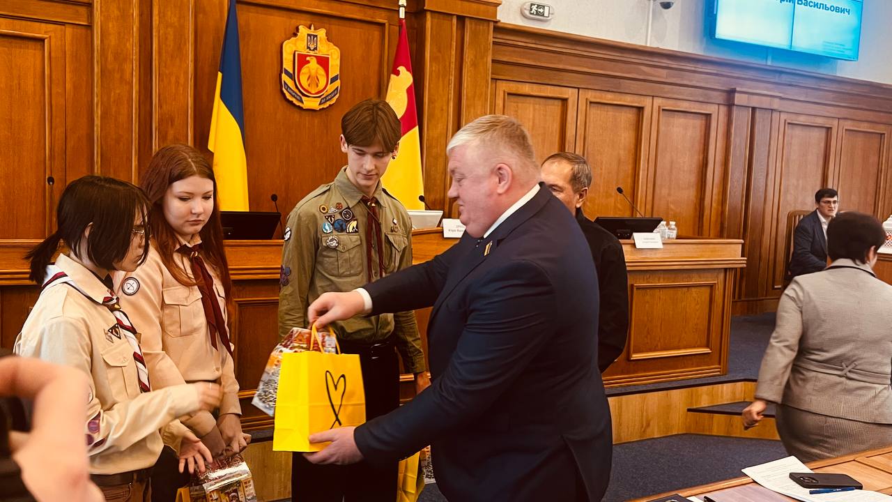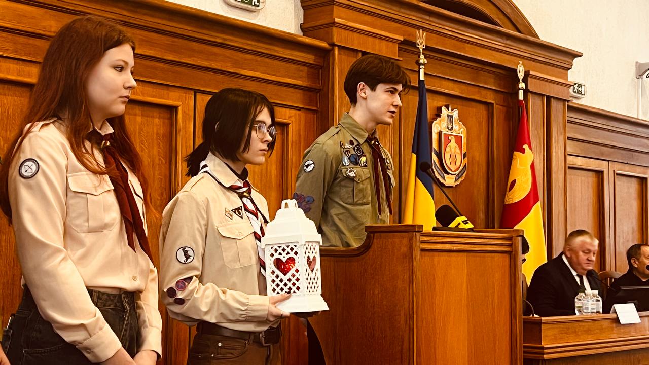 На початку сесiйного засiдання Кiровоградської обласної ради, пластуни передали керiвникам областi та депутатам Вифлеємський вогонь миру.