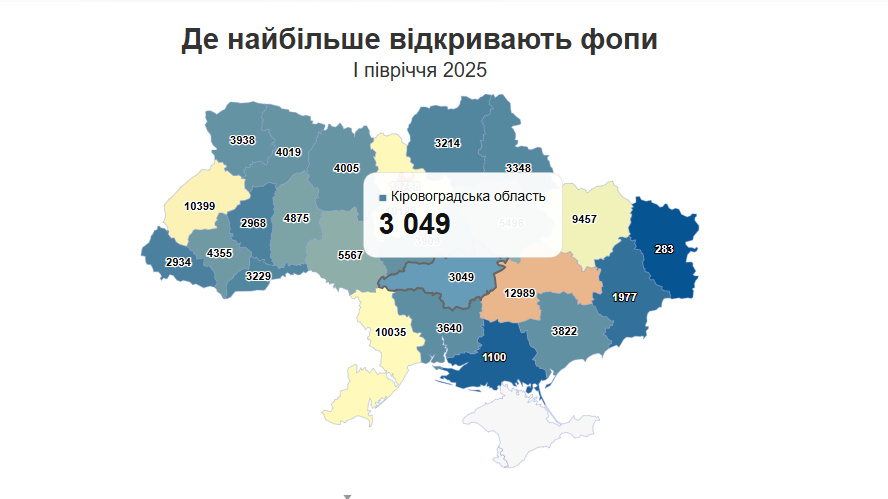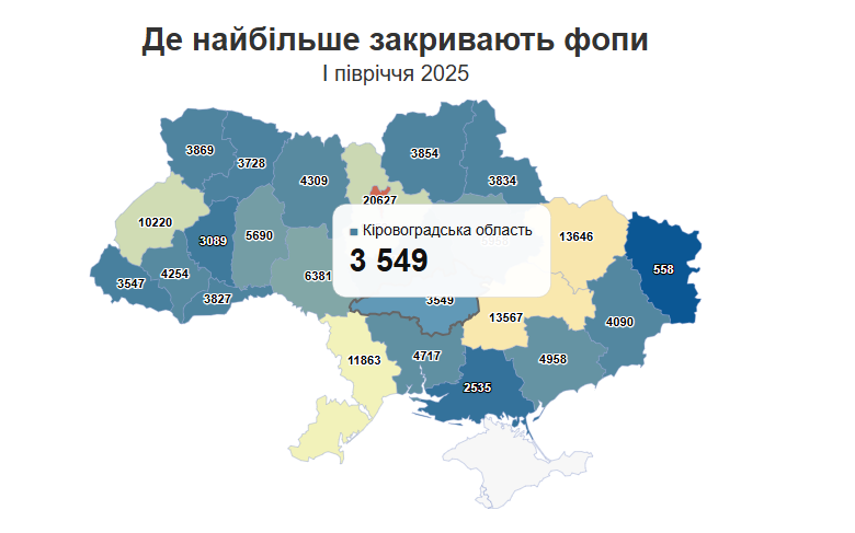 Однак й за кількістю закриття у лідерах також столиця (-20,6 тис фопів) та Дніпропетровщина (13,6 тисячі). На Кіровоградщині закрили 3549 фопів.