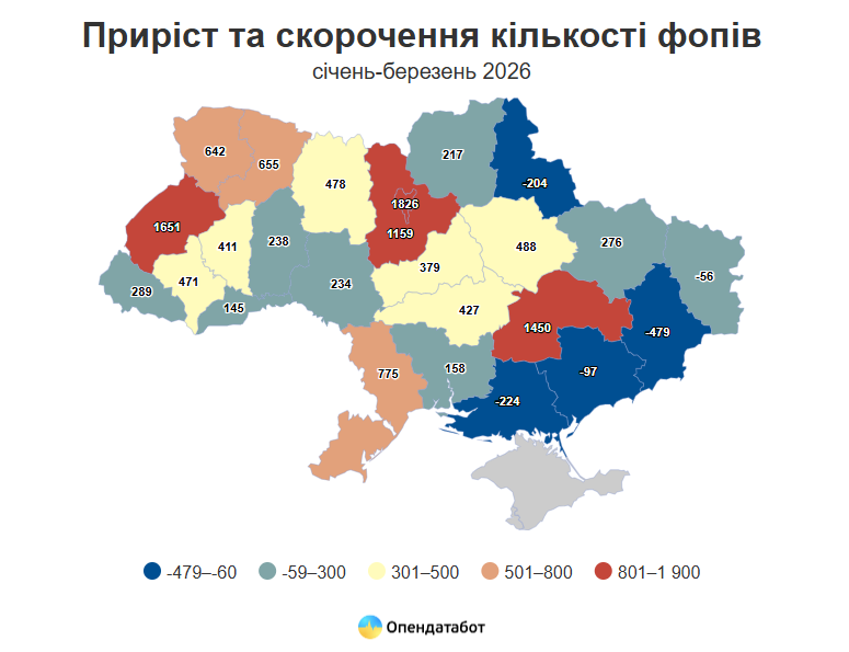 Загалом 63 920 людей вирiшили, що “працювати на себе” звучить краще. Водночас 52 623 фопи дiйшли до висновку, що досить — i закрились. Баланс поки на користь оптимiстiв.