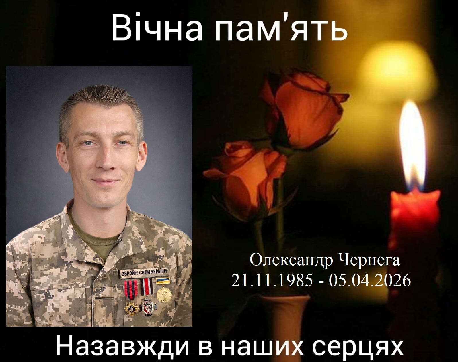 Солдат Олександр Чернега, 1985 року народження. Вiйськовослужбовець артилерiйського взводу. Загинув смертю хоробрих 05 квiтня 2025 року, виконуючи бойове завдання в районi населеного пункту Калинiвка Удачненської селищної громади Покровського району Донецької областi.