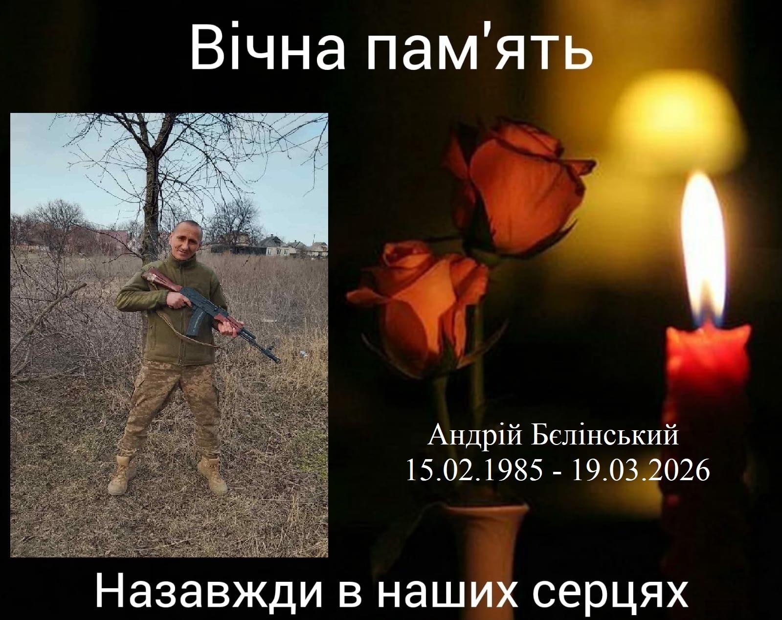 Солдат Андрiй Бєлiнський, 1985 року народження. Водiй взводу бойових машин. Загинув у бою 19 березня 2026 року, пiд час виконання бойового завдання в районi населеного пункту Шевченко Добропiльської мiської ради Донецької областi.