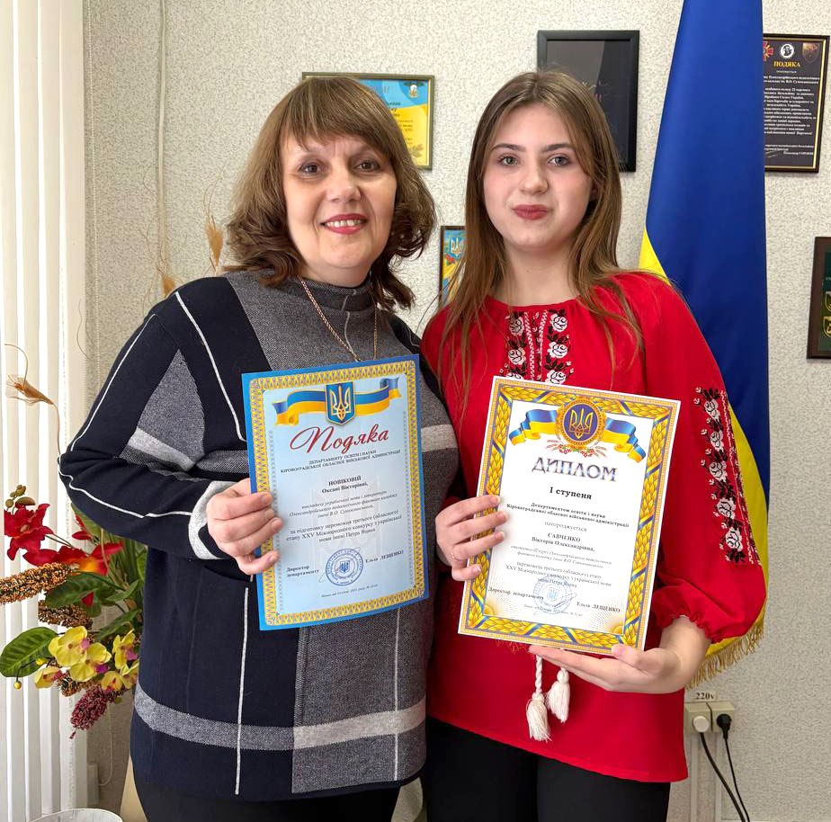 Студентка Олександрiйського педагогiчного фахового коледжу iменi В.О. Сухомлинського Вiкторiя Савченко перемогла в обласному етапi ХХV Мiжнародного конкурсу з української мови iменi Петра Яцика.