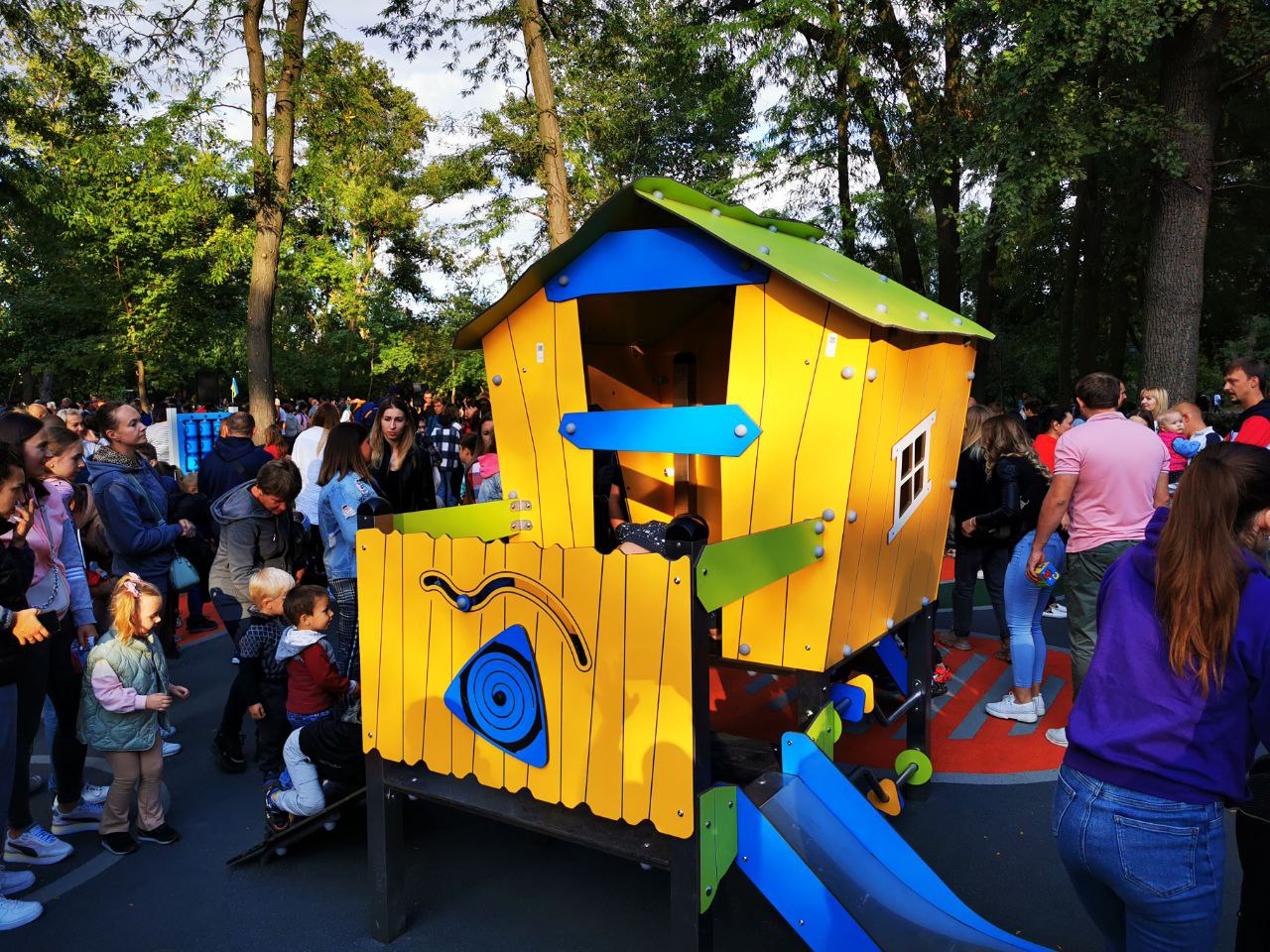 Пiд час вiдкриття iгрового комплексу дiтлахи з цiкавiстю випробовували нове обладнання, гiрки, гойдалки, тарзанки, а iнструктори пiдказували, як ним користуватися.